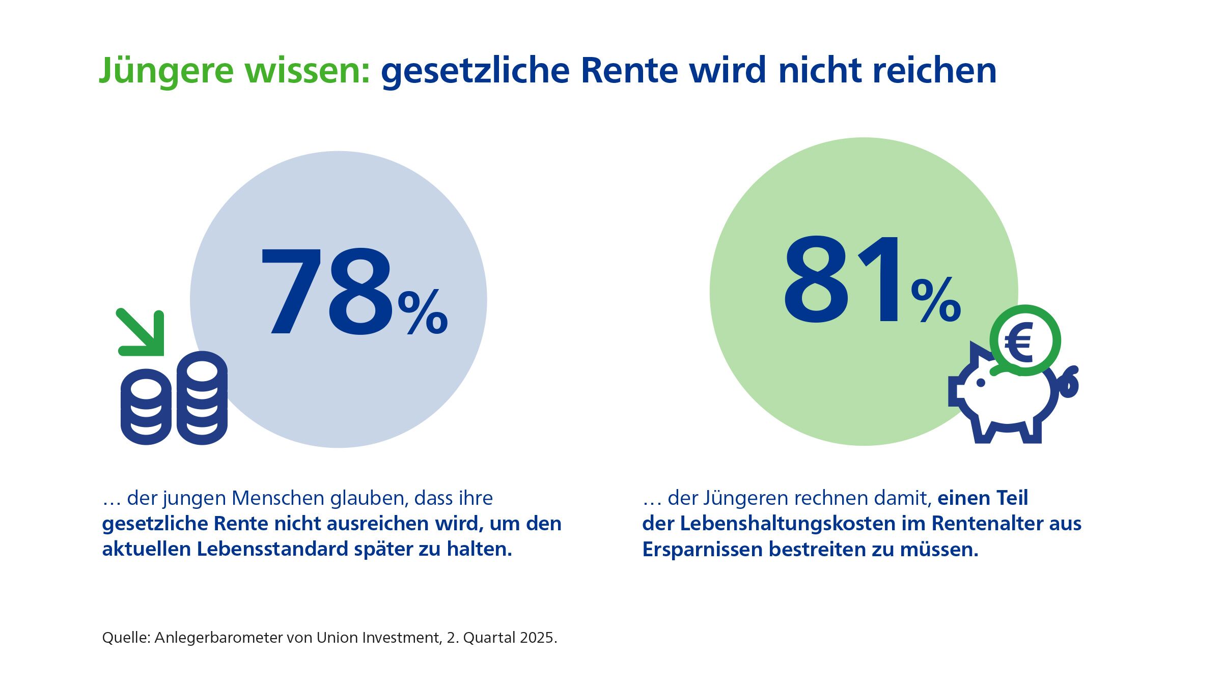 Das Marktforschungsinstitut Forsa hat im Mai 2025 im Auftrag von Union Investment 1.006 Personen im Alter von 20 bis 59 Jahren befragt, die in privaten Haushalten über Finanzen entscheiden und mindestens eine Geldanlage besitzen. Die Befragten nahmen an einer Online-Umfrage teil und konnten sich Zeit und Umgebung der Bearbeitung selbst aussuchen. Bei Umfragewerten, die sich nicht zu 100 Prozent addieren, gibt die Differenz den Anteil der unschlüssigen Befragten an.