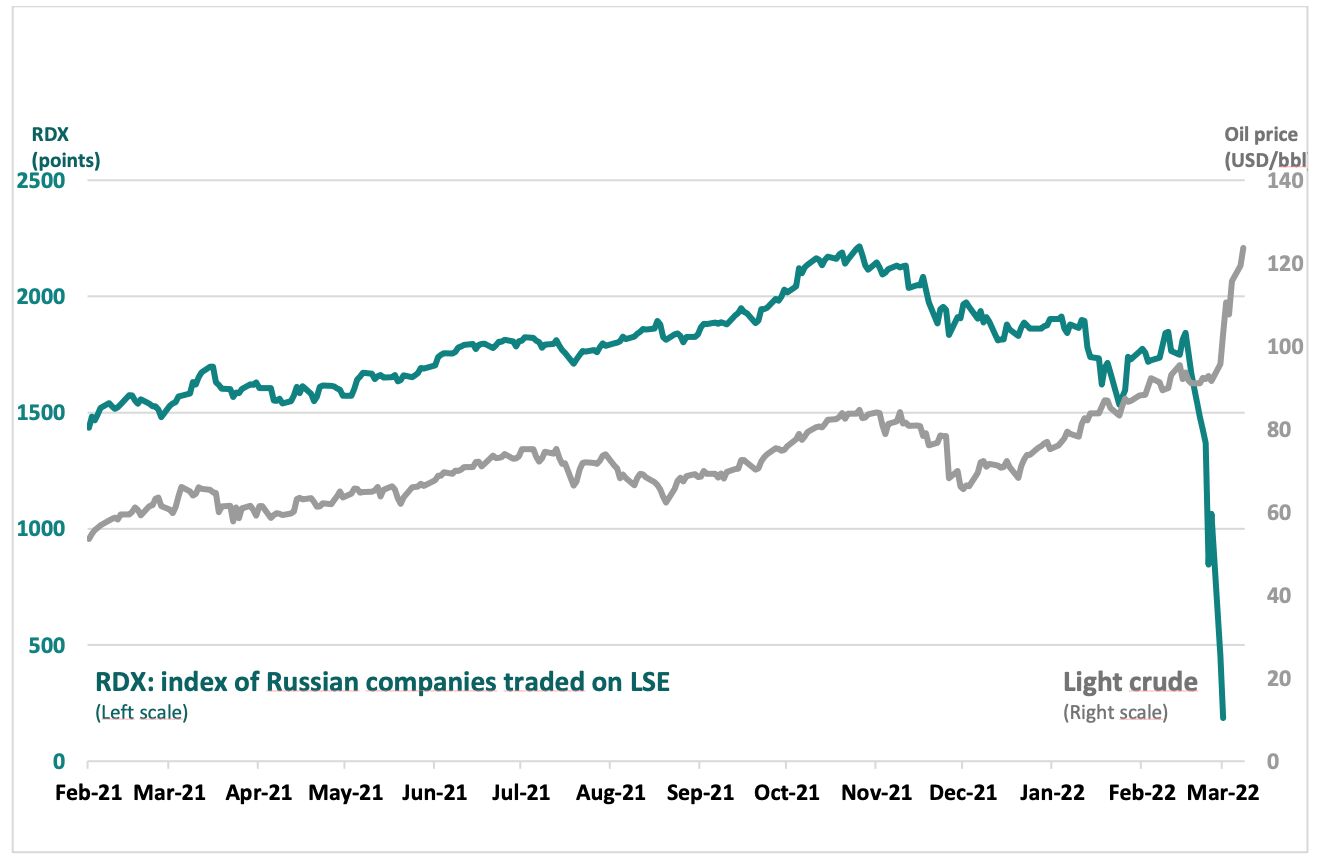 Russische Schuldtitel verloren nahezu unmittelbar nach dem Einmarsch 60% bis 80% ihres Werts. Die in Großbritannien notierten russischen Aktien, hauptsächlich Titel von Banken, Ölproduzenten oder anderen Anbietern von Industrierohstoffen, verzeichneten zwischen dem 16. Februar und dem 1. März, einem Tag bevor die Börsennotierungen ausgesetzt wurden, zeitgleich einen Wertverlust von 92% bis 99%. Parallel dazu schnellten die Gaspreise in Europa umgehend um das Zweieinhalbfache nach oben und Öl verteuerte sich um 55%.