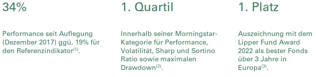 Der Fonds wurde 2017 aufgelegt, um Anlegern eine nachhaltige Anlagelösung mit moderatem Risiko in einem sich stets wandelnden europäischen Umfeld zu bieten. Der Fonds zeichnet sich durch einen agilen und langfristigen Multi-Asset-Class-Ansatz aus. Das Ziel des Fonds ist es, an den europäischen Aktien- und Anleihenmärkten Nischen mit vielversprechenden Titeln zu finden und sich gleichzeitig an unterschiedliche Marktbedingungen und insbesondere an Baissemärkte anzupassen. Das Exposure gegenüber den Aktienmärkten kann daher zwischen 0% und 50% des Portfolios variieren, und wir als Portfoliomanager haben die Möglichkeit, dieses Exposure jederzeit zu ändern. Dies versetzt uns in die Lage, schnell und wirkungsvoll zu reagieren, wenn die wirtschaftlichen, politischen oder sozialen Bedingungen dies aus unserer Sicht erfordern.