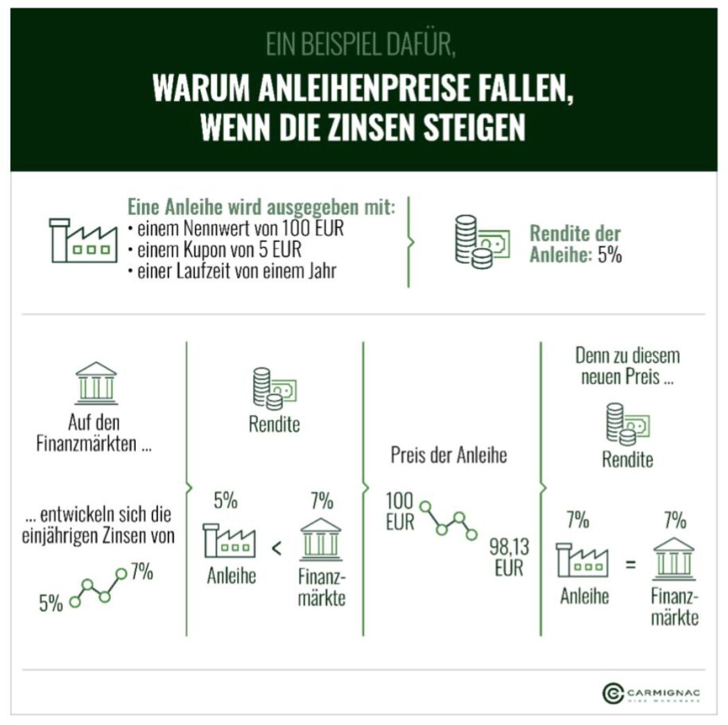 Schwankungen der Zinssätze beeinflussen nämlich den Wert von Anleihen, da dieser in dem Maße sinkt, in dem die Zinsen steigen. Die Inflation belastet wiederum den realen Ausgleich eines Anlegers, da der Preisanstieg die Realrendite einer Anlage verringert.