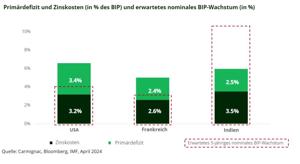2 Der IMF Fiscal Monitor signalisiert bis 2029 einen Rückgang um 1% auf 2% des BIP, während sie in den USA stabil bei 3,4% des BIP bleiben und in Frankreich auf 2,8% des BIP steigen dürfte.