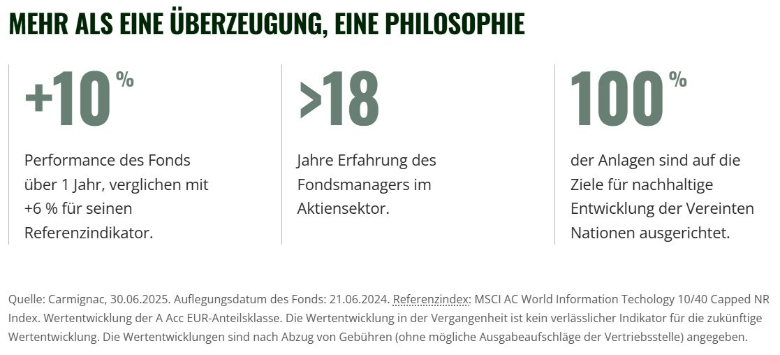 Quelle: Carmignac am 30. Jun 2025. Die Wertentwicklung der Vergangenheit ist keine Garantie für die zukünftige Wertentwicklung. Sie verstehen sich nach Abzug von Gebühren (außer eventuellen Ausgabeaufschlägen, die von der Vertriebsstelle erhoben werden). Referenzindikator: MSCI AC World Information Technology 10/40 Capped NR index.