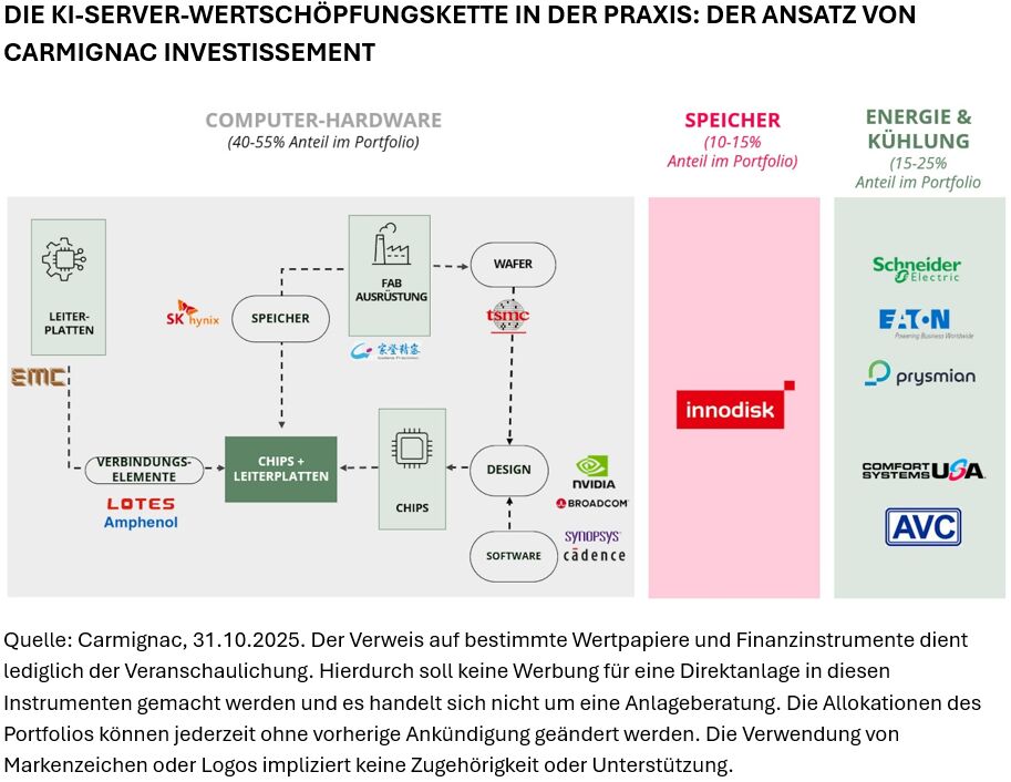 Investitionen in verschiedene Ebenen desselben Ökosystems tragen zur Diversifikation der Performance-Treiber bei. Hinter jedem weltweit führenden Unternehmen steht ein Netzwerk von Akteuren; Lieferanten, Dienstleister und Nischenspezialisten, deren oft unterschätzter Beitrag für die Gesamtdynamik der Branche von entscheidender Bedeutung ist. Heute bildet der Fonds mehrere Wertschöpfungsketten nebeneinander ab. Neben einer Reihe von Technologie-Subsegmenten umfasst das Portfolio auch Sektoren wie Luft- und Raumfahrt, Automobilindustrie und Finanzinfrastruktur. Zwei Bereiche veranschaulichen diesen Ansatz besonders gut: Rechenzentren für Künstliche Intelligenz (KI) und Gesundheitsunternehmen, die relativ immun gegen Schwankungen der Arzneimittelpreise sind.