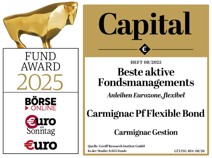 Carmignac Portfolio Flexible Bond wurde bei den deutschen Capital Awards 2025 als „Bestes aktives Fondsmanagement” in der Kategorie „Euro-Anleihen, flexibel” ausgezeichnet.