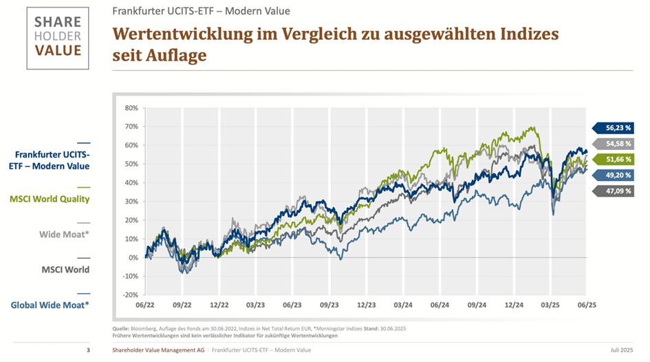 Im Rahmen des e-fundresearch.com-Webinars „30 Minuten mit Shareholder Value Management“ präsentierten Vorstand Philipp Prömm und Kapitalmarktstratege Heiko Böhmer den bisherigen Weg des Frankfurter UCITS-ETF – Modern Value (ISIN: LU2439874319, WKN: FRA3TF) , der seit Auflage am 30. Juni 2022 eine annualisierte Rendite von rund 16,0% erzielt hat (Stand: 30.06.2025). Die zugrunde liegende Methodik – der „Frankfurter Modern Value Index“ – wird seit Juni 2020 systematisch erfasst. Seither konnte der ETF nicht nur gegenüber Benchmarks wie dem MSCI World, MSCI World Quality oder Global Wide Moat-Strategien überzeugen, sondern auch mit einem attraktiven Verhältnis von Rendite zu Drawdown punkten.