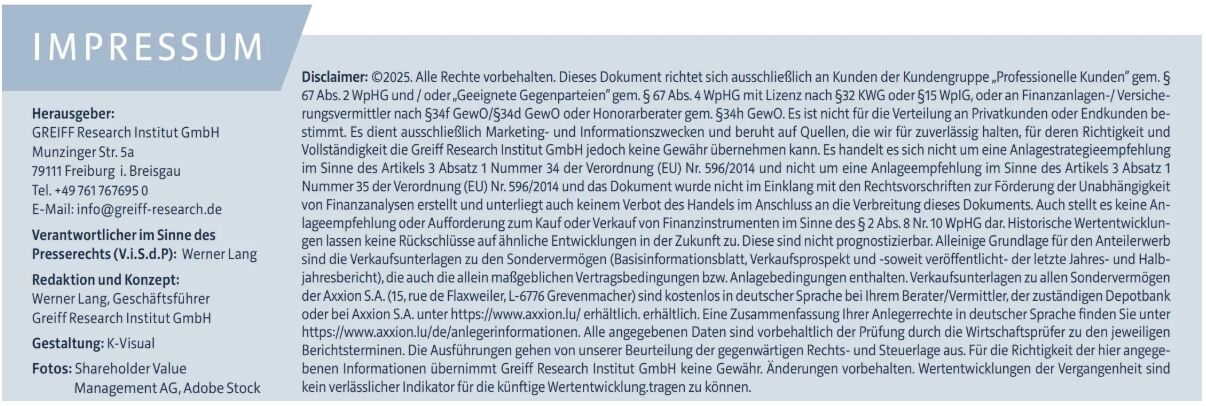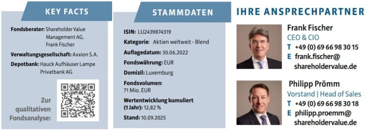 Die eigentümergeführte Investment-Boutique Shareholder Value Management AG mit Sitz in Frankfurt am Main legt seit über 25 Jahren besonderen Wert auf Qualität und Substanz bei der Aktienauswahl. Gegründet Ende der 90er Jahre als Family Office, berät das Haus heute Fonds und Mandate mit einem Volumen von mehr als 1 Mrd. Euro. Vorstandsvorsitzender und CIO ist Frank Fischer, 2018 zum Fondsmanager des Jahres gekürt. Unterstützt wird er im Vorstand von Philipp Prömm (Head of Sales) sowie Jens Große-Allermann, der seit 2024 als Co-CIO fungiert und die Investmentkompetenz der Gesellschaft weiter stärkt.