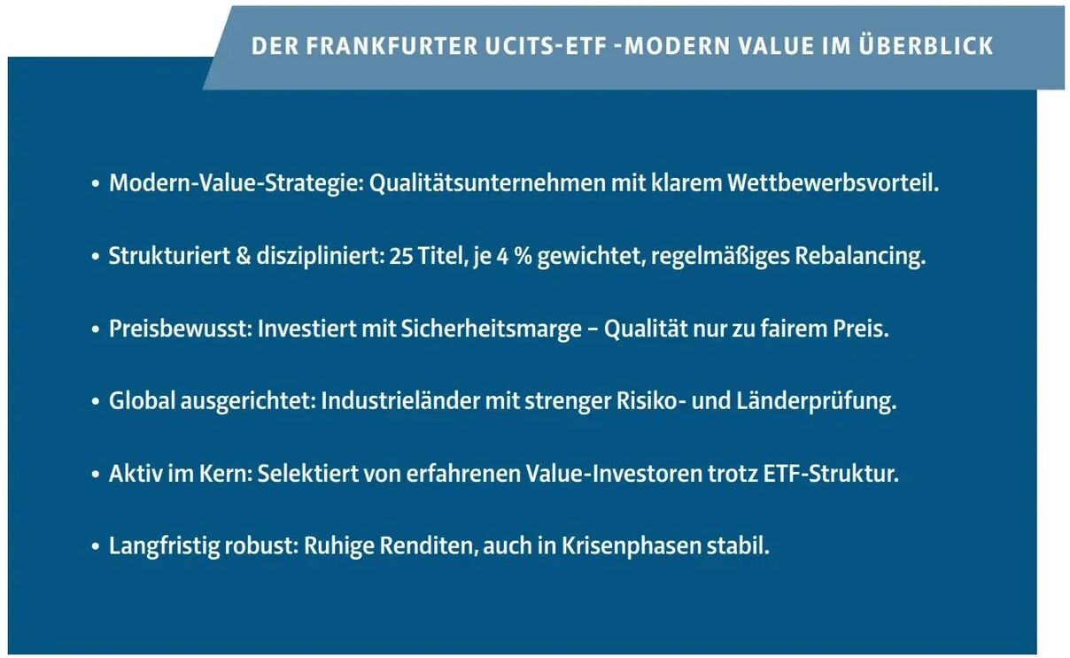 Die Grundlage für den ETF bildet der Frankfurter Modern Value Index, der 2021 in Kooperation mit Solactive entwickelt wurde. Bereits im Backtest bis 2020 zeigte sich die Stärke des Konzepts. Für die Umsetzung im UCITS-Rahmen wurden starke Partner gewonnen: Axxion S.A. als Kapitalverwaltungsgesellschaft, Hauck Aufhäuser Lampe als Depotbank sowie Flow Traders als Market Maker. Seit dem 30. Juni 2022 ist der Frankfurter UCITS-ETF – Modern Value (WKN FRA3TF) handelbar und ergänzt das Produktportfolio der Gesellschaft um ein konzentriertes, transparentes Aktieninvestment im ETF-Mantel.