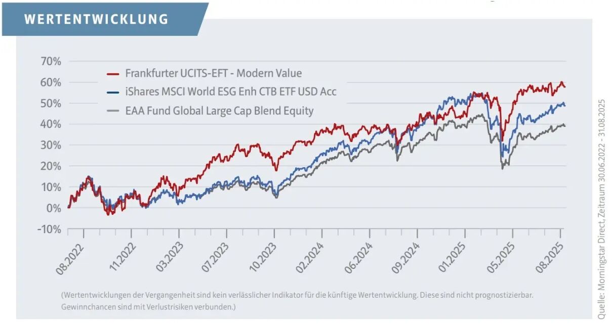 Die Bilanz seit Auflage fällt beeindruckend aus. Mit einer Wertsteigerung von über 57% und einer durchschnittlichen Jahresrendite von gut 15% schlägt der Frankfurter UCITS-ETF – Modern Value nicht nur vergleichbare MSCI-World-ETFs, sondern auch die Morningstar-Peergroup deutlich. Die Fokussierung auf 25 Titel bringt zwar naturgemäß stärkere Schwankungen mit sich, doch die Risikokennzahlen zeigen ein robustes Profil: Mit einer Volatilität von rund 13% und einem maximalen Drawdown von etwa 15% liegt der ETF in einem attraktiven Rahmen, insbesondere im Vergleich zu breiten Marktindizes.