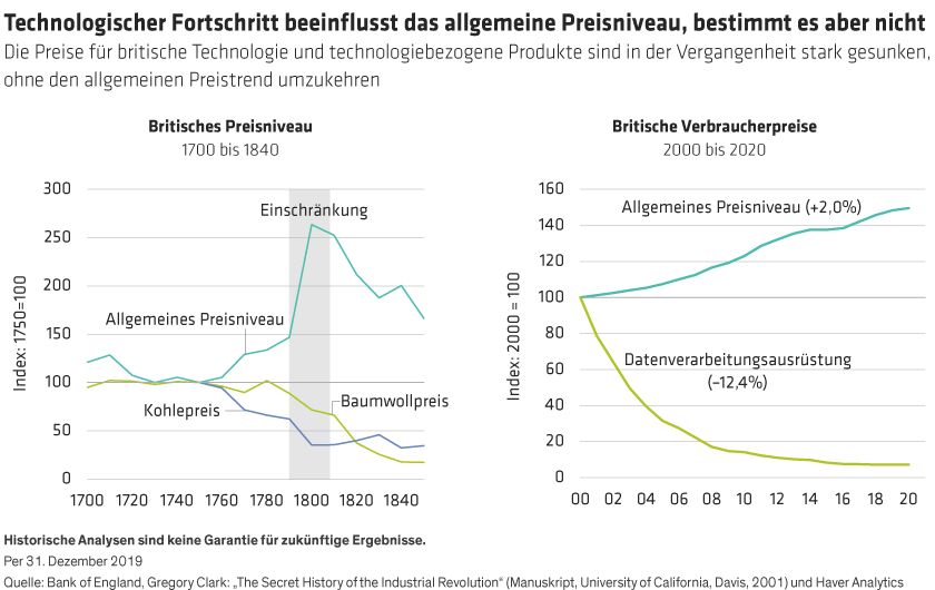 Frühere technologische Revolutionen können einen Anhaltspunkt bieten – und sie haben nicht immer zu einem niedrigeren allgemeinen Preisniveau geführt. Während der ersten industriellen Revolution zum Beispiel stieg das allgemeine Preisniveau in Großbritannien stark an, als die britische Regierung zwischen 1797 und 1821 die Konvertierbarkeit von Papiergeld in Gold aussetzte. Diese Aufwärtsbewegung erfolgte trotz des starken Abwärtsdrucks auf die Preise einiger Rohstoffe (Abbildung oben links). Dieses Muster hat sich in den letzten Jahren sogar wiederholt, wobei die Inflation in Großbritannien trotz eines massiven Rückgangs der Preise für technologiebezogene Produkte nahe an der Zielmarke von 2 % liegt (Abbildung rechts).
