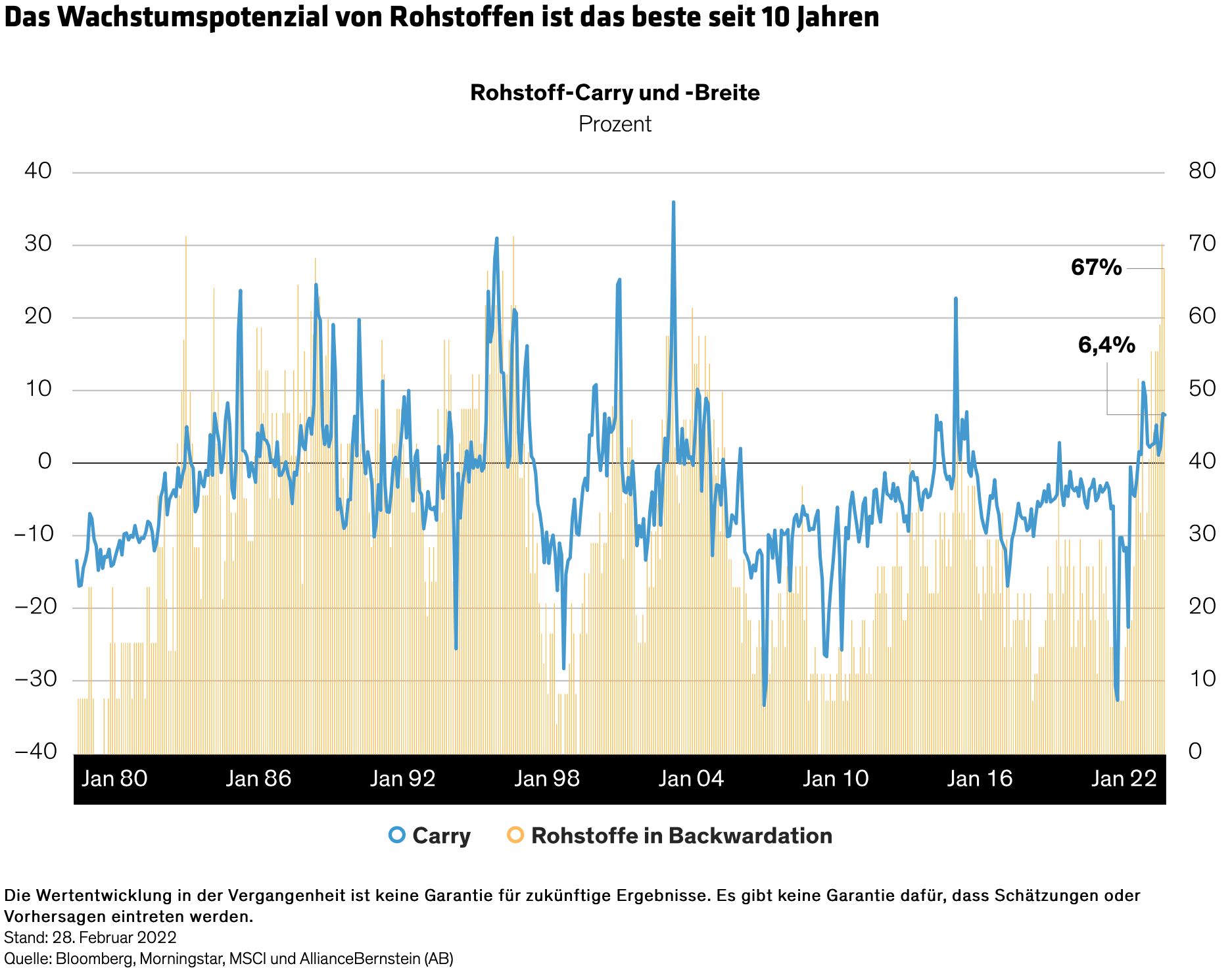In letzter Zeit erleben wir jedoch gleichzeitig eine fundamentale Stärke bei einer Vielzahl von Rohstoffen. Insbesondere aufgrund der weitverbreiteten Knappheit befinden sich die meisten Rohstoffe derzeit in einer sogenannten Backwardation: Ihre aktuellen Preise liegen über den Preisen vergleichbarer Kontrakte für zukünftige Lieferungen, was durch positive Carry-Zahlen angezeigt wird (Abbildung).