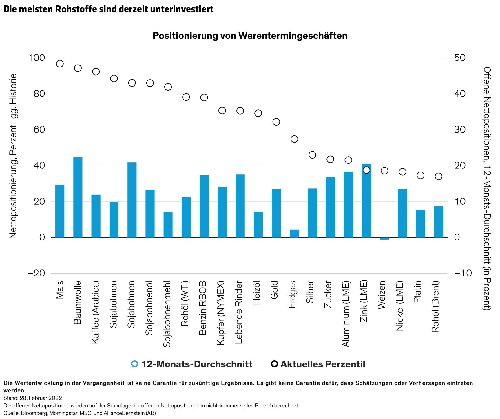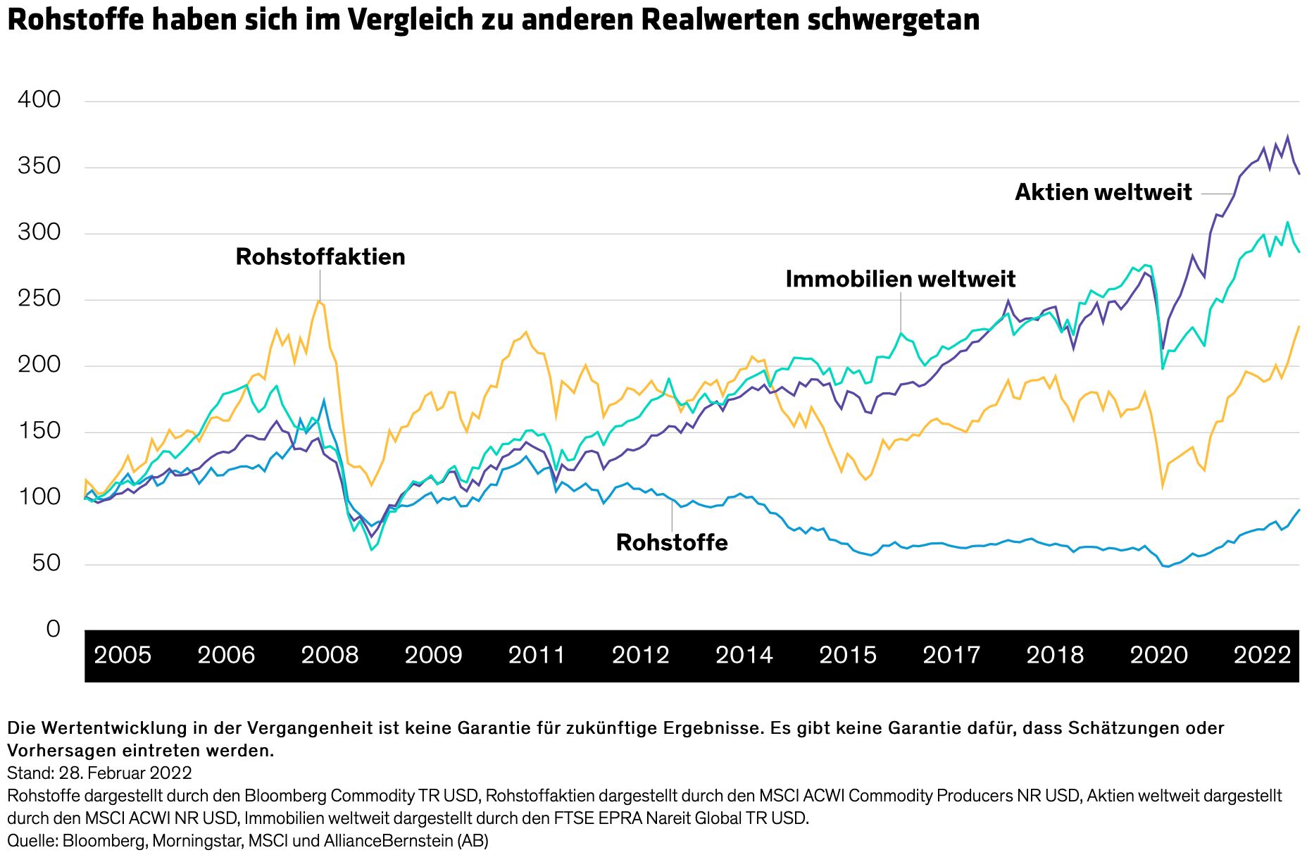Im Allgemeinen scheinen Rohstoffe immer attraktiver zu werden, und sie haben sich in der Vergangenheit in einem Umfeld mit hoher Inflation und geopolitischen Risiken, wie es heute der Fall ist, besser entwickelt als der breite Markt. Allerdings sind sie extrem volatil und können sich über längere Zeiträume schlechter als Aktien entwickeln. Daher ist es wichtig, das Engagement in Rohstoffen mit Bedacht zu wählen.