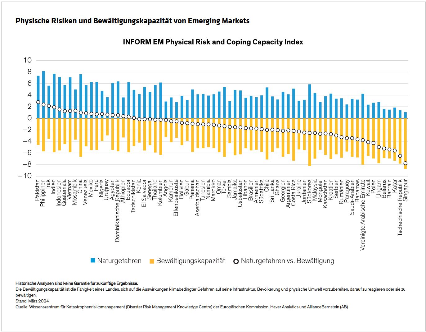 Emerging Markets (EM) sind besonders anfällig für physische Risiken, die häufig die Form von Überschwemmungen oder Dürren annehmen. Glücklicherweise beobachten wir, dass die Regierungen und der Privatsektor in diesen Regionen mehr Bewältigungsmechanismen einsetzen. Dazu gehören Anpassungspläne, Frühwarnsysteme für mehrere Gefahren und Risikobewertungen, die unserer Meinung nach dazu beitragen, die hohe Exposition gegenüber physischen Risiken der Schwellenländer auszugleichen (Abbildung). Dies deutet darauf hin, dass auch Länder mit hohen physischen Risiken wirksame Maßnahmen ergreifen könnten, um diese Risiken zu steuern und ihre Kreditwürdigkeit zu verbessern.