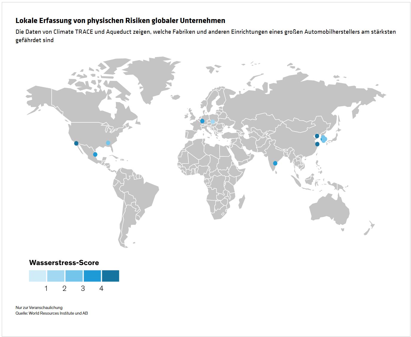 Eine weitere Schwierigkeit bei der Bewertung physischer Risiken ist die Zuordnung zu den physischen Standorten der Unternehmen, da in der Regel keine einheitliche Berichterstattung dazu erfolgt. Hier macht jedoch das Tool Climate TRACE (Tracking Real-time Atmospheric Carbon Emissions) Fortschritte. Seine Modelle helfen Anlegern, die Standorte globaler Unternehmen mit hohen Emissionen zu ermitteln. In Kombination mit den Daten des Aqueduct Water Risk Atlas können die Ergebnisse effektiv aufzeigen, wo die physischen Risiken eines globalen Unternehmens lokal am größten sind (Abbildung). Viele führende Datenanbieter wie Moody's, S&P und MSCI bieten inzwischen ebenfalls Tools zur Analyse von physischen Risikoszenarien an – allerdings mit teilweise widersprüchlichen Ergebnissen, die eine sorgfältige Bewertung erfordern.