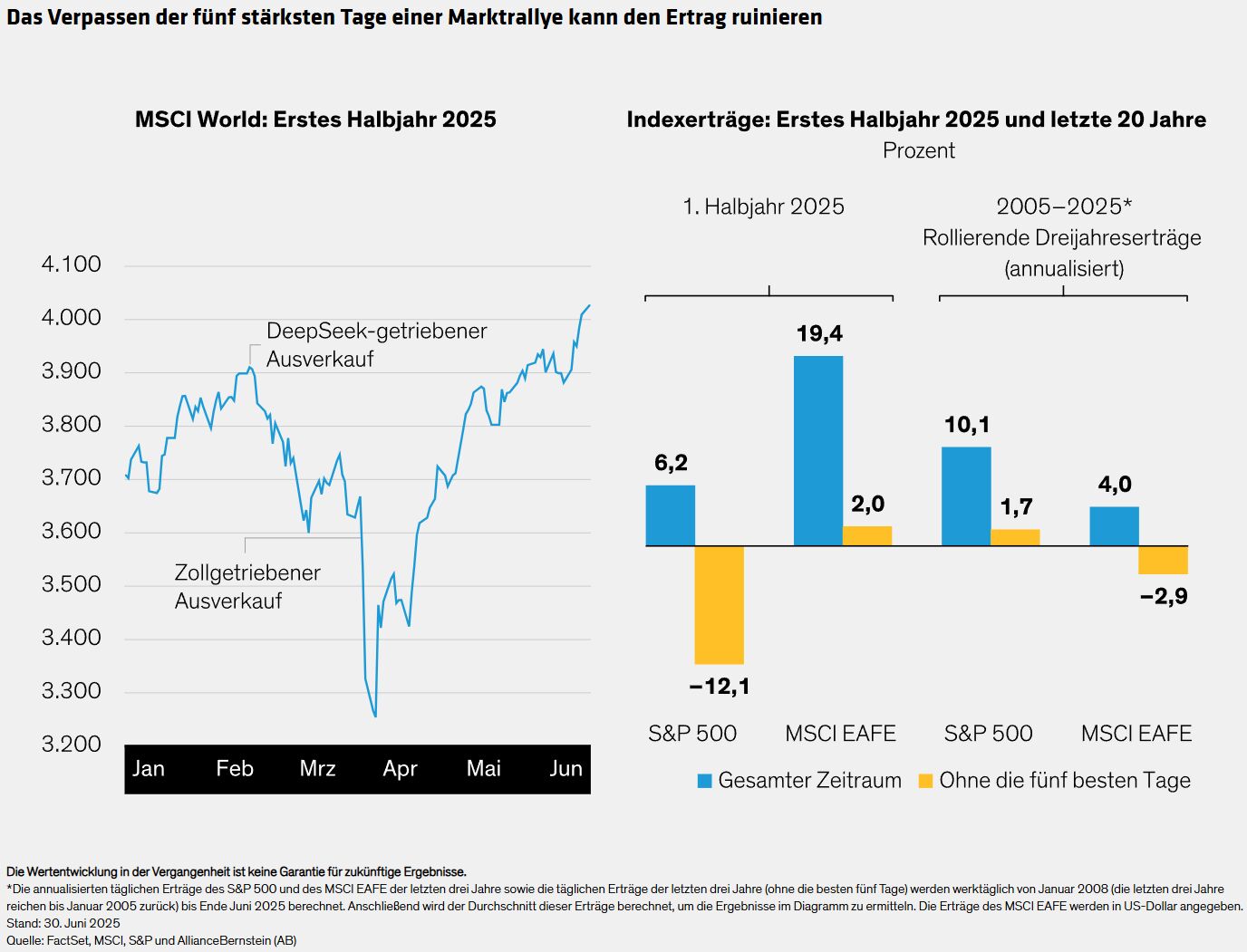 Bis zum Quartalsende erreichten die Aktien Rekordhöhen. Lässt man die fünf besten Tage der Erholung jedoch außer Acht, verschlechterten sich die Erträge dramatisch. Für den S&P 500 bedeutete das Verpassen der fünf besten Tage im ersten Halbjahr 2025 einen Verlust von 12,1 %, verglichen mit einem Gewinn von 6,2 % für den gesamten Zeitraum (Abbildung). Diese Trends spiegeln langfristige Muster wider, die in den letzten 20 Jahren an den Aktienmärkten beobachtet wurden, als das Verpassen von nur fünf Tagen in jedem rollierenden Dreijahreszeitraum die Erträge deutlich schwächte.