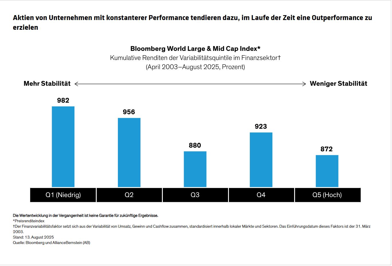Konstantes Wachstum stärkt das Renditepotenzial von Aktien. Aktien von Unternehmen mit stabileren Umsätzen, Gewinnen und Cashflows haben langfristig besser abgeschnitten als solche mit größerer Variabilität (Abbildung).