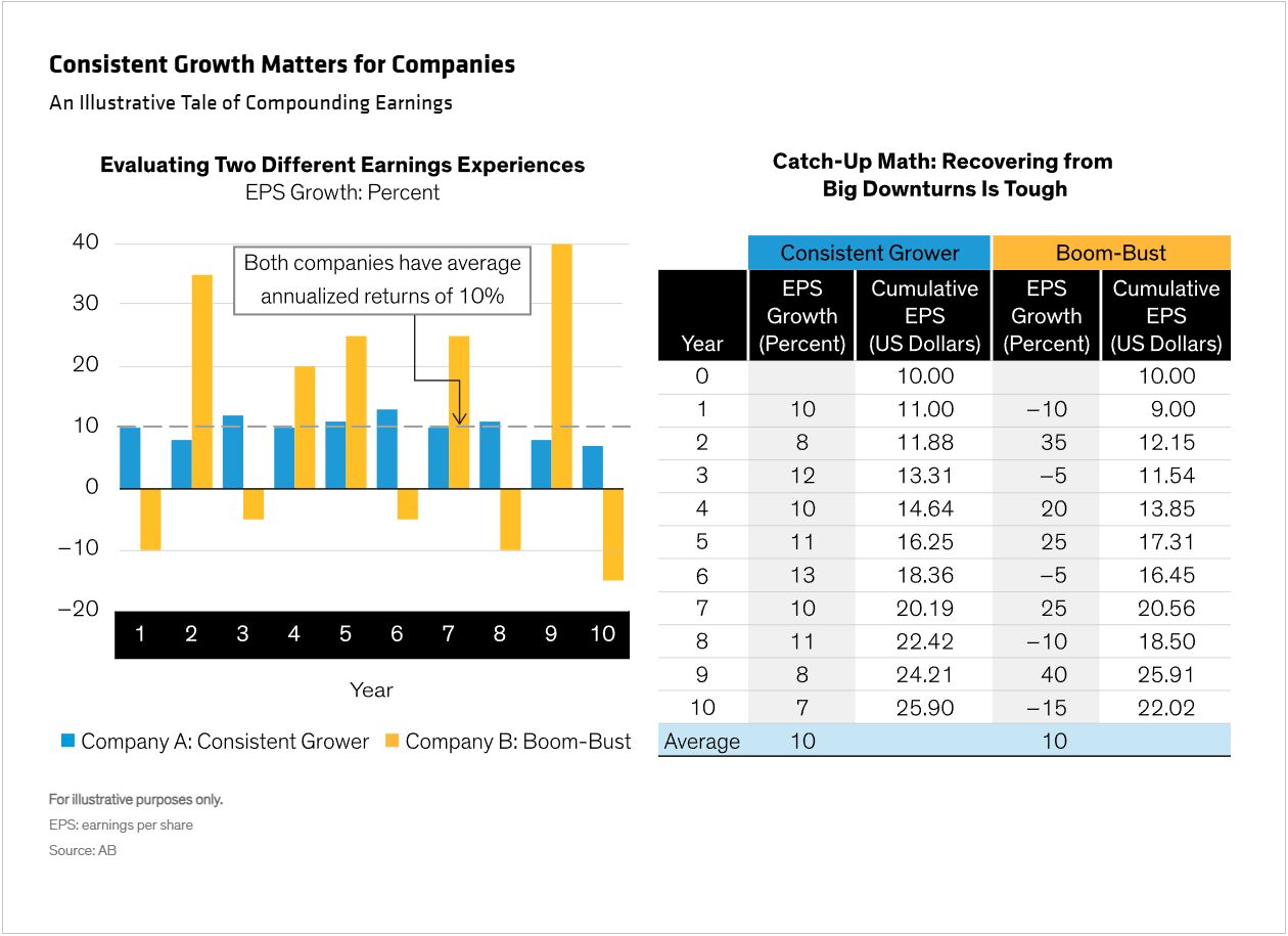 Wir sind überzeugt, dass Unternehmen mit nachhaltigem, stetigem Wachstum einen Anker in unsicheren Zeiten bieten und Anlegern effektiver beim Vermögensaufbau helfen können als volatile Unternehmen mit höheren, aber unregelmäßigen Renditemustern. Und wenn Anleger solche Unternehmen mit attraktiven Kursbewertungen finden, stärkt dies die Widerstandsfähigkeit, insbesondere in rückläufigen Märkten, in denen teure Aktien stärker betroffen sein können. Aktienportfolios, die diszipliniert auf nachhaltiges Wachstum zum richtigen Preis setzen, können in ein oder zwei Jahren zwar niedrigere Jahresrenditen erzielen – doch durch die Zinseszinseffekte auf konstante Renditen könnten sie langfristig tatsächlich die Nase vorn haben .