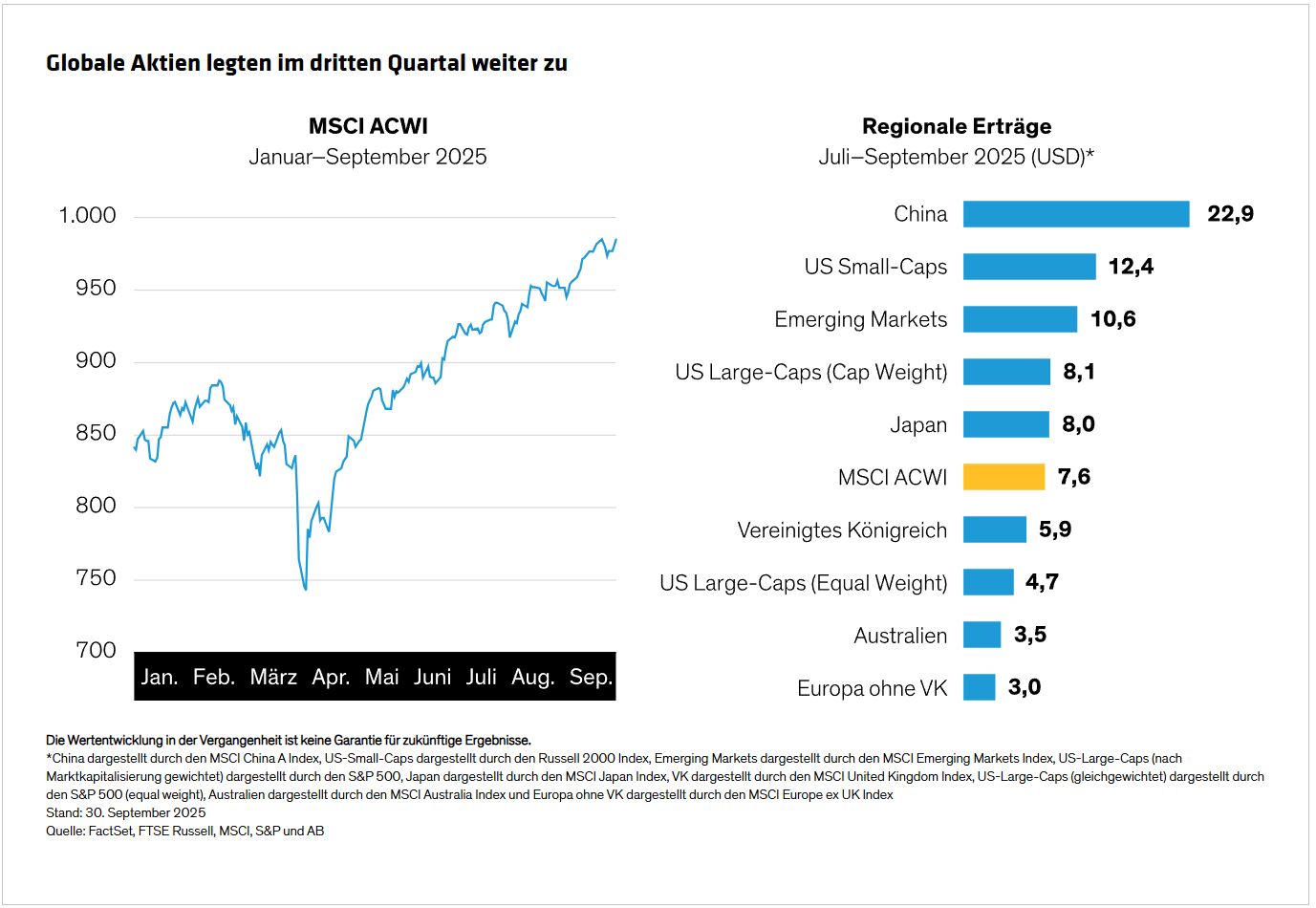 Nach einer Erholung im zweiten Quartal legte der internationale Gesamtmarktindex MSCI ACWI im dritten Quartal um weitere 7,6% in US-Dollar zu (Abbildung) und erzielte damit seit Jahresbeginn ein Plus von 18,4%. Aktien der Emerging Markets setzten ihren Umschwung fort und stiegen um 10,6%, während China dank staatlicher Konjunkturmaßnahmen und starker Einzelhandelsumsätze um mehr als 22% zulegte. US-Small-Caps übertrafen US-Large-Caps, die dem globalen Index leicht voraus waren. Auch japanische Aktien schnitten geringfügig besser ab als der globale Markt, während europäische Aktien nur geringe Gewinne erzielten.