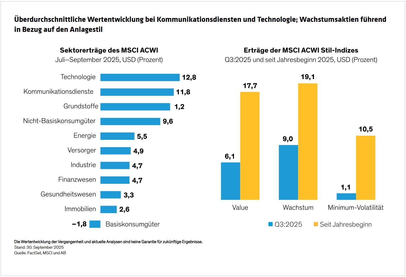 Im dritten Quartal kam es zu Verlagerungen bei den Erträgen einiger Sektoren (Abbildung), wobei Finanzwerte und Industriewerte nach einem starken ersten Halbjahr eine unterdurchschnittliche Wertentwicklung verzeichneten. Die Aktien von Kommunikationsdienstleistern konnten jedoch ihre dominante Entwicklung aus dem ersten Halbjahr fortsetzen, während sich Technologieaktien nach einem schwachen Jahresauftakt weiter erholten.