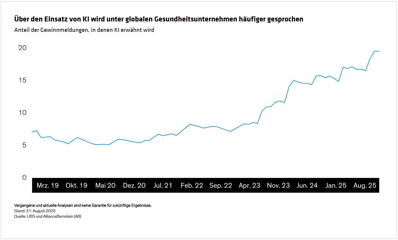 Technologischer Fortschritt war schon immer ein Treiber für Veränderungen in der Gesundheitsbranche, die stark von Datenmanagement und neuen wissenschaftlichen Erkenntnissen abhängt. KI markiert nun die nächste Entwicklungsstufe – von schnelleren Zulassungsverfahren für Medikamente und verbesserten Patientenerfahrungen bis hin zu Roboterchirurgie und Pflastern, die Krebs erkennen können. Das Thema KI taucht bei Gesundheitsunternehmen immer häufiger auf (Abbildung), auch wenn bislang nur ein relativ kleiner Teil der Branche aktiv an konkreten Anwendungen arbeitet. Wir sehen in KI jedoch einen entscheidenden Differenzierungsfaktor, der in den kommenden Jahren zu größerem geschäftlichem Erfolg, stärkerem Wachstum und höheren Aktienerträgen führen kann.