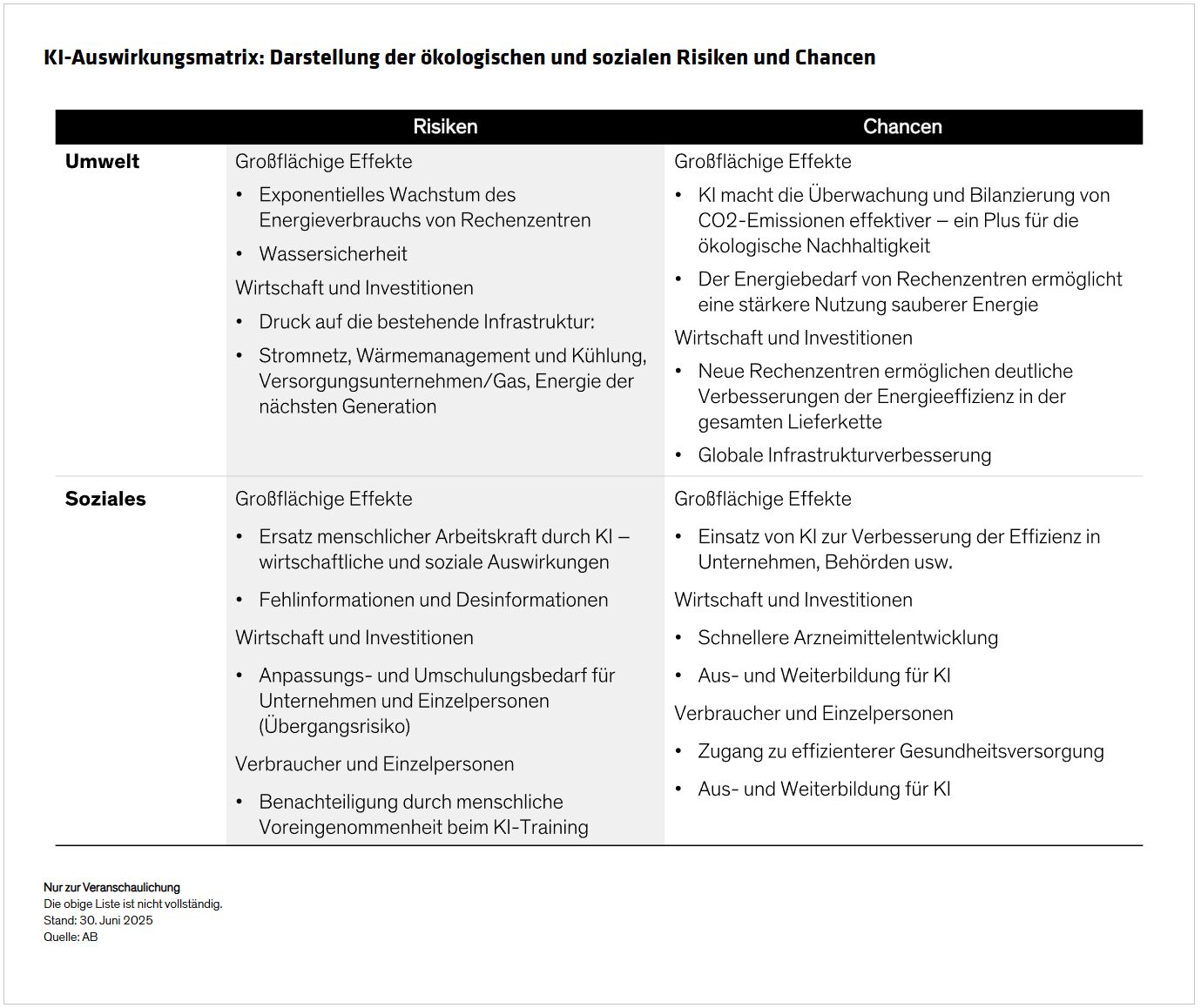 Dieser Energiebedarf bietet in zweierlei Hinsicht Chancen. Er ermöglicht die verstärkte Nutzung sauberer Energien , und Hyperscaler steigern die Energieeffizienz ihrer Rechenzentren – und treiben damit Veränderungen in ihren Lieferketten voran, die sich für Investoren als Chancen erweisen können. Das Risiko besteht jedoch darin, dass viele neue KI-Rechenzentren mit Erdgas – einer nicht sauberen Energiequelle – betrieben werden, was die langfristigen CO2-freien Verpflichtungen der Hyperscaler gefährden könnte.