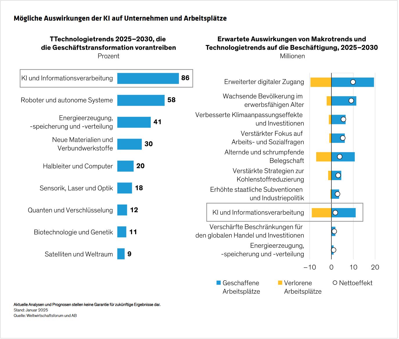 Laut Future of Jobs Report 2025 des Weltwirtschaftsforums erwarten Unternehmen, dass KI und Informationstechnologie bis 2030 den größten Wandel in ihren Geschäftsabläufen bewirken werden. Die Auswirkungen auf die Beschäftigung könnten jedoch insgesamt gering ausfallen ( Abbildung ).