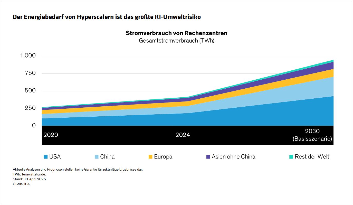 Das vielleicht größte Umweltrisiko, das von KI ausgeht, ist ihr Energiebedarf, da Hyperscaler – Unternehmen, die riesige, skalierbare und bedarfsgerechte Rechenressourcen bereitstellen – ihre Rechenzentren im großen Stil ausbauen. Die Nachfrage dürfte in absehbarer Zukunft weiter steigen ( Abbildung ).