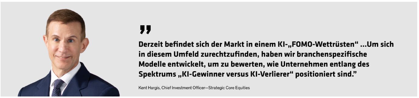 Derzeit befindet sich der Markt in einem KI-„FOMO-Wettrüsten“, was durch Aussagen von Mark Zuckerberg und anderen führenden Technologie-Managern veranschaulicht wird, dass die Kosten einer Unterinvestition höher seien als die einer Überinvestition. Um sich in diesem Umfeld zurechtzufinden, haben wir branchenspezifische Modelle entwickelt, um zu bewerten, wie Unternehmen entlang des Spektrums „KI-Gewinner versus KI-Verlierer“ positioniert sind. Auch wenn das Timing von Zyklen naturgemäß schwierig bleibt, sind wir überzeugt, dass ein fundamentaler Ansatz, der sich auf die Identifizierung echter KI-Gewinner konzentriert, erhebliches Alpha-Potenzial bietet.