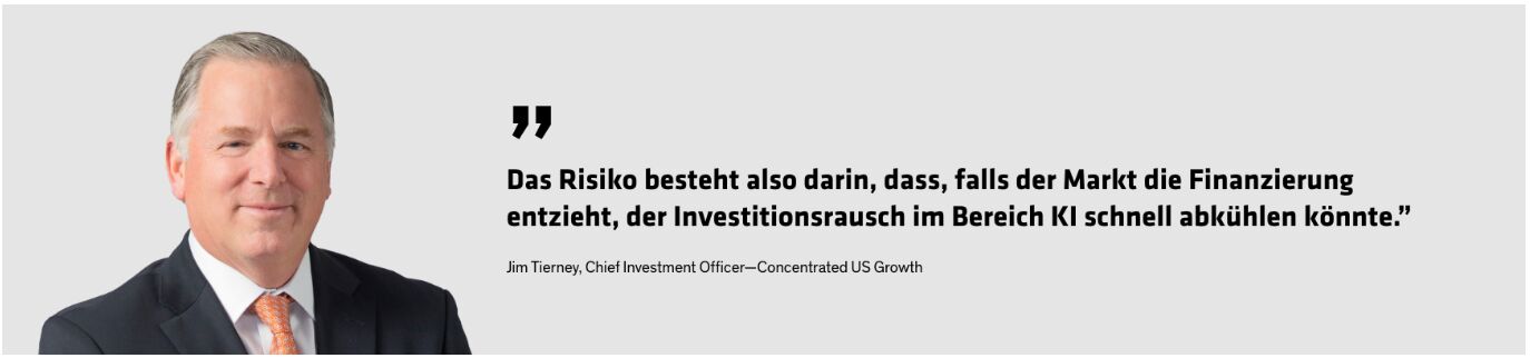 Jim Tierney, Chief Investment Officer – Concentrated US Growth: Ich stimme John zu, was die Anfälligkeit des Marktes betrifft. Denken Sie an die jüngste Ankündigung, dass NVIDIA 100 Milliarden US-Dollar an OpenAI – einen Großkunden – geben will, damit OpenAI mehr Grafikprozessoren (GPUs) kaufen kann. Dieses zirkuläre Geschäft wirft große Fragen auf. Es erinnert mich an Pets.com und die Internetblase der späten 1990er-Jahre. Hier ist OpenAI der große Geldgeber, obwohl das Unternehmen seit Jahren einen negativen freien Cashflow aufweist. Das Risiko besteht also darin, dass, falls der Markt die Finanzierung entzieht, der Investitionsrausch im Bereich KI schnell abkühlen könnte. Alles, was mit dem KI-Sektor zu tun hat, basiert auf der Annahme, dass die Investitionsausgaben über Jahre hinweg weiter steigen werden. Aber dieses Szenario kann aus vielen Richtungen gestört werden, z. B. durch energieeffizientere Chips, geringere inkrementelle Modellzuwächse, Energiebeschränkungen, Grenzen für KI-Produktivitätssteigerungen und Überkapazitäten. Wir sind der Ansicht, dass es im Bereich KI derzeit keine einfachen Gewinne oder risikofreien Chancen gibt.