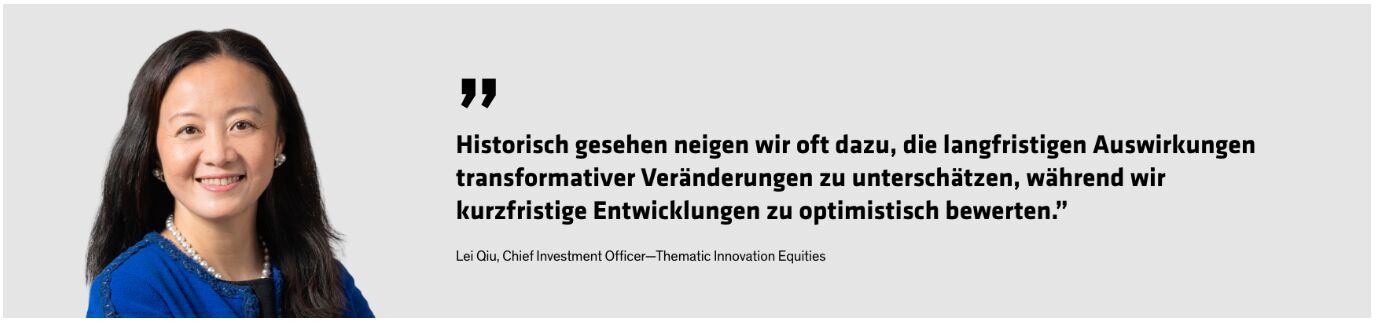 Lei Qiu, Chief Investment Officer – Thematic Innovation Equities: Ich denke, es ist wahrscheinlich zu einfach, die gesamte KI-Revolution als Blase zu bezeichnen. Historisch gesehen neigen wir oft dazu, die langfristigen Auswirkungen transformativer Veränderungen zu unterschätzen, während wir kurzfristige Entwicklungen zu optimistisch bewerten. Disruptive Veränderungen treten meist plötzlich und drastisch auf, doch Anleger erwarten in der Regel, dass sich Veränderungen in einem stetigen, linearen Verlauf vollziehen. Diese Diskrepanz kann heftige Schwankungen in der Marktstimmung und bei Aktienkursen auslösen. Wenn es zu einer Fehlbewertung von Unternehmen mit stark fremdfinanzierten Geschäftsmodellen kommt, werden „Blasen“ platzen.
