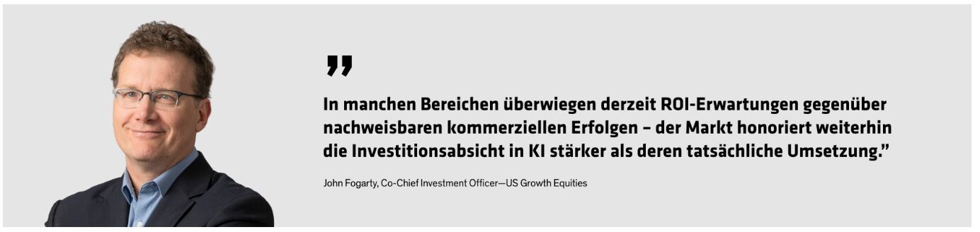 John Fogarty, Co-Chief Investment Officer – US Growth Equities: Die KI-Story dominierte die Erholung der US-Aktienmärkte in den Jahren 2023–24 nach dem Rückgang im Jahr 2022, insbesondere bei den Technologieriesen. KI dominiert auch im Jahr 2025 weiterhin die Wertentwicklung der Aktienmärkte. Über NVIDIA hinaus wurden weitere Infrastrukturanbieter durch die steigenden Ausgaben für den Ausbau von Rechenzentren angeregt und belohnt. Das ist jedoch mehr als nur ein Hype, denn die Enge des Marktes lässt sich teilweise durch den erheblichen Beitrag dieses Investitionszyklus zum BIP erklären. Doch die Frage, ob sich diese Trends aufrechterhalten lassen, bleibt entscheidend.