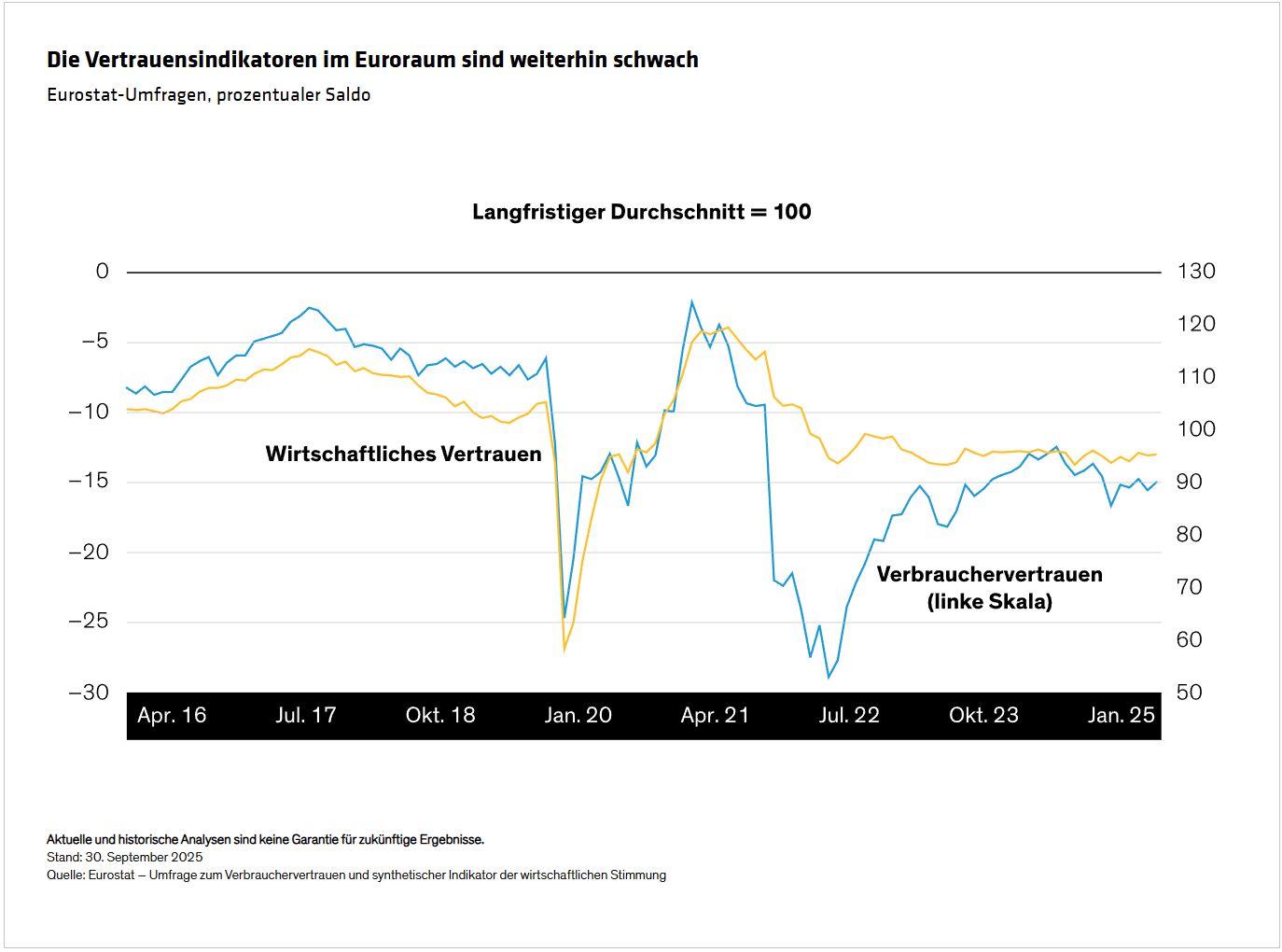 Wir sehen einen verbesserten langfristigen Ausblick für die Wirtschaft des Euroraums: Das schlimmste mögliche Szenario bezüglich der US-Zölle wurde vermieden, und fiskalische Anreize stehen bevor. Kurzfristige Risiken bestehen jedoch weiterhin. Zum einen sind die vollständigen Auswirkungen der neuen Zölle noch nicht spürbar. Zudem dürften schwache Vertrauensindikatoren (Abbildung, unten) und inländische Probleme in einigen Ländern (insbesondere die lang anhaltende politische Pattsituation in Frankreich) den privaten Konsum und die Investitionen weiterhin bremsen.