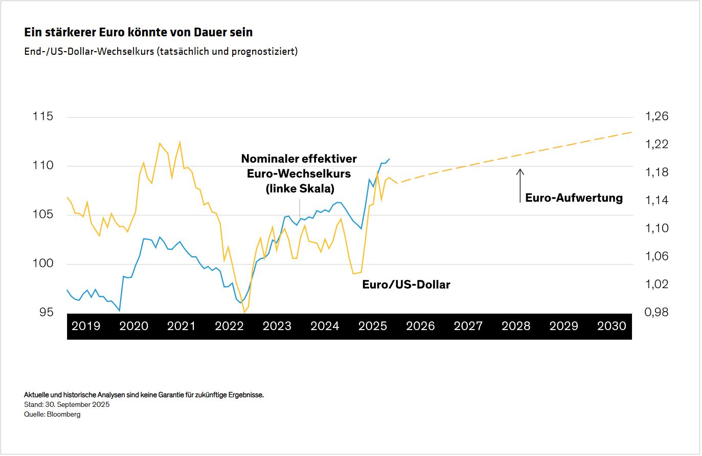 Eine stärkere Währung führt in der Regel zu geringerer Inflation, da sie Importe verbilligt und den Wettbewerb erhöht. Zugleich beeinträchtigt sie die Wettbewerbsfähigkeit der Exporteure und dämpft die Gesamtnachfrage. Der Euro hat in diesem Jahr gegenüber dem US-Dollar fast 15% zugelegt und erreichte ein Hoch von 1,18.