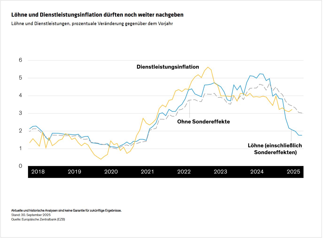 Während die Inflation im Euroraum derzeit im Zielbereich liegt, geht sie weiterhin zurück. Die Dienstleistungsinflation (die rund 46% des Verbraucherpreisindex im Euroraum ausmacht) war bislang hartnäckig, lässt jedoch nun nach, als Reaktion auf geringeres Wachstum und die Normalisierung nach der Pandemie- und Energiekrise. Das Lohnwachstum verläuft ähnlich (Abbildung, unten) und wird wahrscheinlich zu einem weiteren Rückgang der Dienstleistungsinflation beitragen. Die EZB möchte die Gesamtinflation im Zielbereich halten, doch diese Dynamik birgt das Risiko, dass die Inflation mittelfristig unter das Ziel fällt.