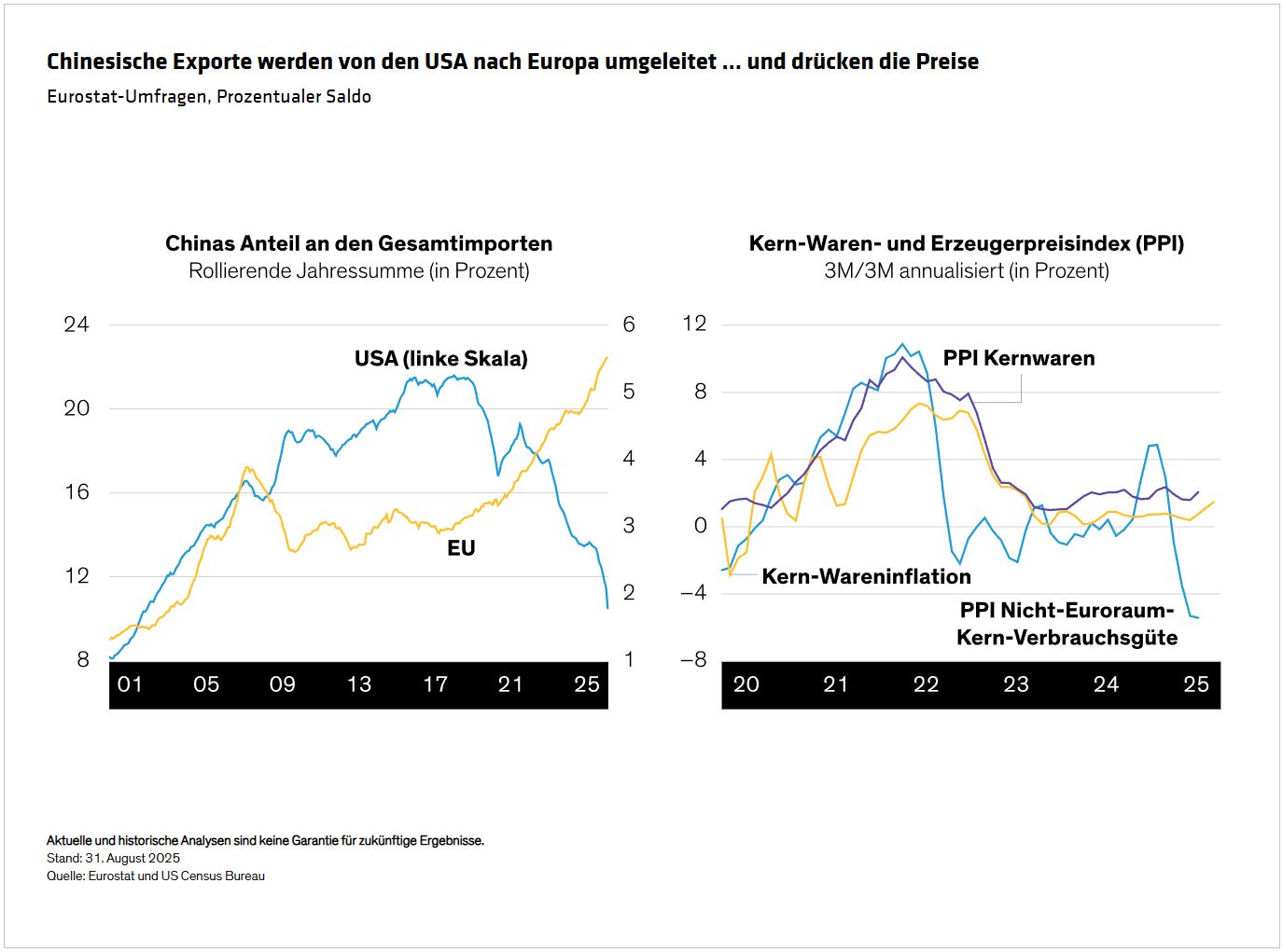 Die Handelskonflikte des Jahres 2025 führen weltweit zu stärkerem Wettbewerb – und zu niedrigeren Preisen. Die Importpreise aus Nicht-Euroraum-Ländern in die EU sind seit April 2025 deutlich gesunken. Wenn sich dieser Trend fortsetzt, wird er früher oder später Druck auf die Kern-Wareninflation in der EU ausüben.