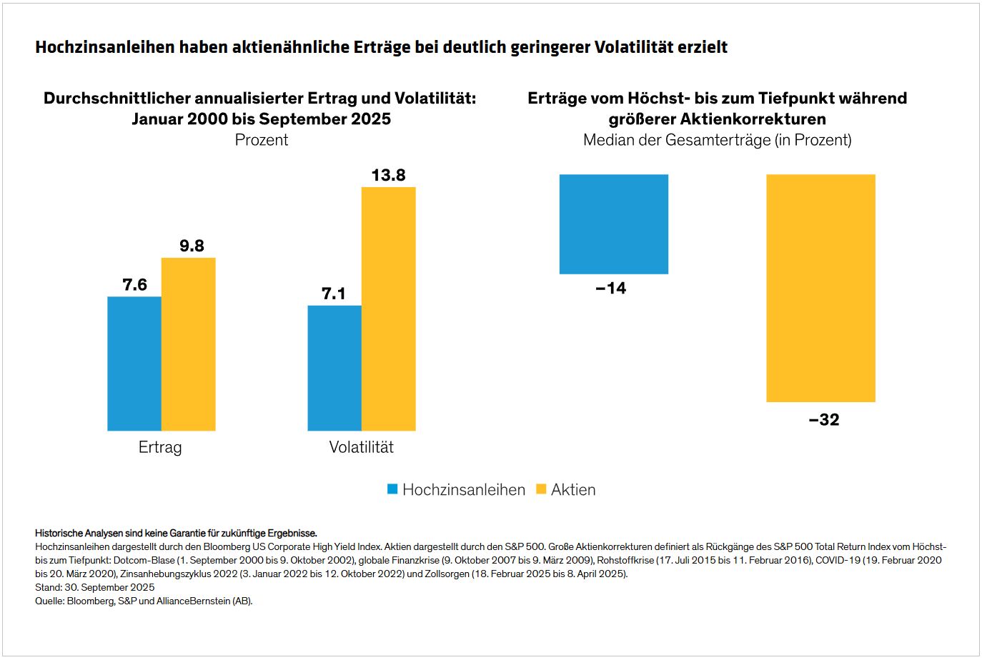 Über längere Zeiträume hinweg haben Hochzinsanleihen historisch gesehen aktienähnliche Erträge bei deutlich geringerem Risiko erzielt. Seit dem Jahr 2000 verzeichnete der Bloomberg US Corporate High Yield Index einen durchschnittlichen annualisierten Ertrag von 7,6% bei einer durchschnittlichen jährlichen Volatilität von 7,1%. Im gleichen Zeitraum erzielte der S&P 500 durchschnittlich 9,8%, allerdings mit einer Volatilität von 13,8% – etwa doppelt so hoch wie bei Hochzinsanleihen (Abbildung, links). Diese Dynamik ist insbesondere in schwierigen Marktphasen stark, in denen Hochzinsanleihen historisch gesehen nur 44% der Aktienrückgänge mitgemacht haben (Abbildung, rechts).