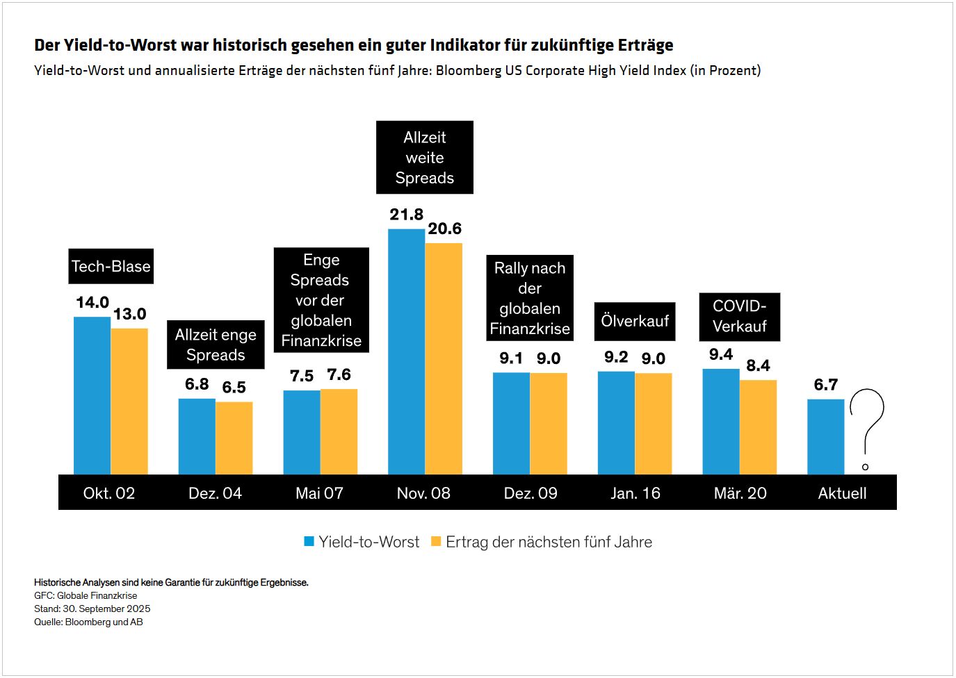 Die Umlaufrenditen bleiben trotz der erneuten geldpolitischen Lockerungskampagne der Fed erhöht. Derzeit liegt der Yield-to-Worst des Hochzinssektors bei 6,7 % – ein historisch hoher Wert. Hohe Renditen können einer wachstumsorientierten Strategie eine attraktive Einkommenskomponente verleihen. Das bedeutet jedoch nicht, dass auf Wachstumspotenzial verzichtet werden muss. Tatsächlich war der Yield-to-Worst historisch gesehen ein zuverlässiger Indikator für die Erträge der nächsten fünf Jahre (Abbildung).
