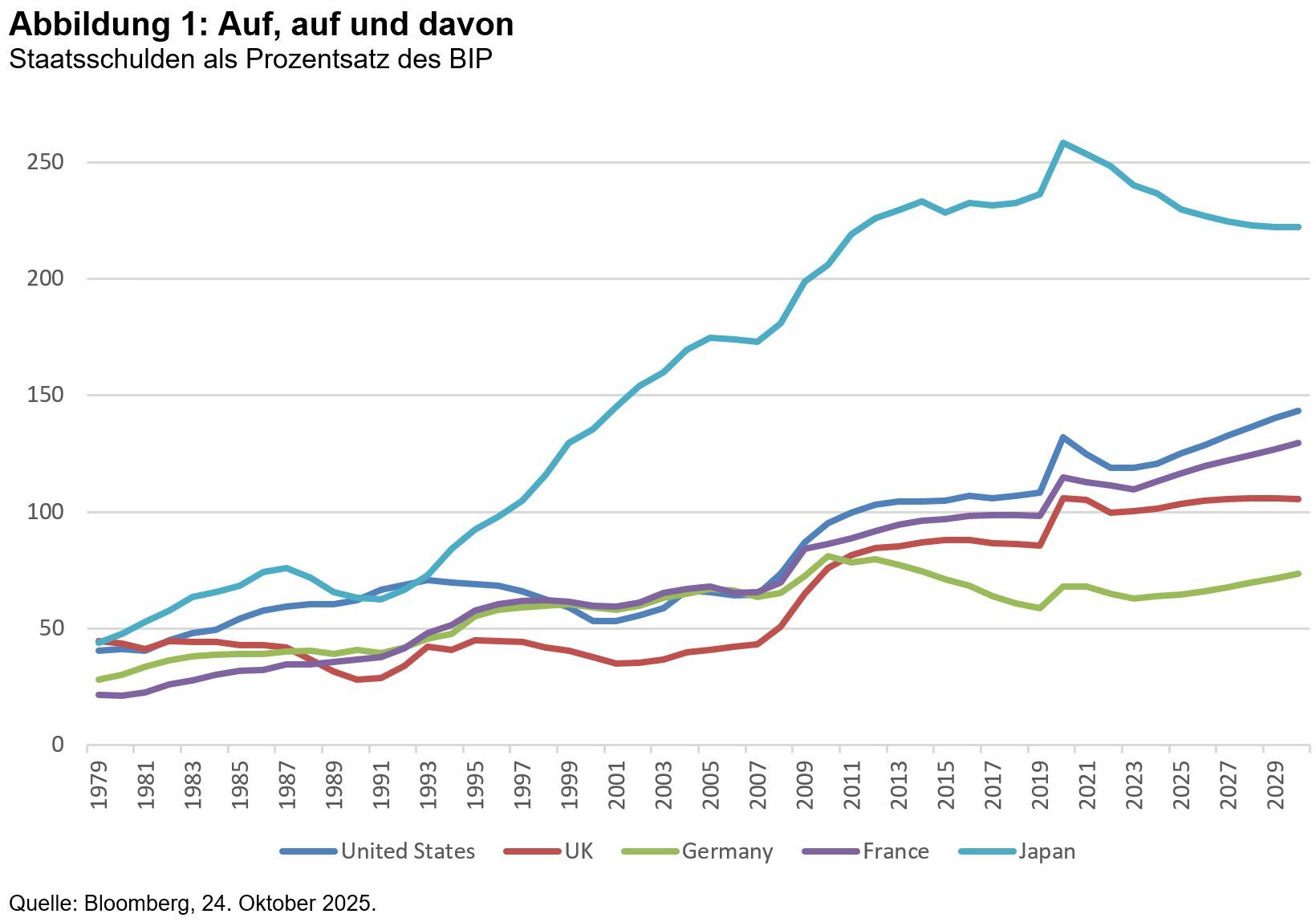 Auch die Staatsverschuldung wird zunehmend zu einer Belastung für die Märkte (Abbildung 1). Die USA sind auf dem besten Weg, bis zum Ende des Jahrzehnts eine Schuldenquote von über 130 Prozent des Bruttoinlandsprodukts (BIP) zu erreichen. Das Haushaltsdefizit Frankreichs hält sich hartnäckig bei über 5 Prozent des BIP, und die Staatsverschuldung des Landes wird bis 2026 voraussichtlich 118 Prozent des BIP erreichen. Mit schwindendem Vertrauen kann es dann schnell zu einer Neubewertung kommen. Die Tatsache, dass die Renditen 10-jähriger Staatsanleihen in Frankreich, diejenigen Italiens und Spaniens übersteigen – obwohl diese während der Eurokrise 2009 die Hauptsorgenkinder waren –, zeigt, wie schnell Anleger finanzielle Risiken neu bewerten können, selbst innerhalb der entwickelten Märkte. Vor dem Hintergrund der steigenden Staatsverschuldung ist es möglich, dass eine Finanzierungskrise in einer großen Volkswirtschaft die Kreditkosten auch in anderen Ländern erhöhen könnte.