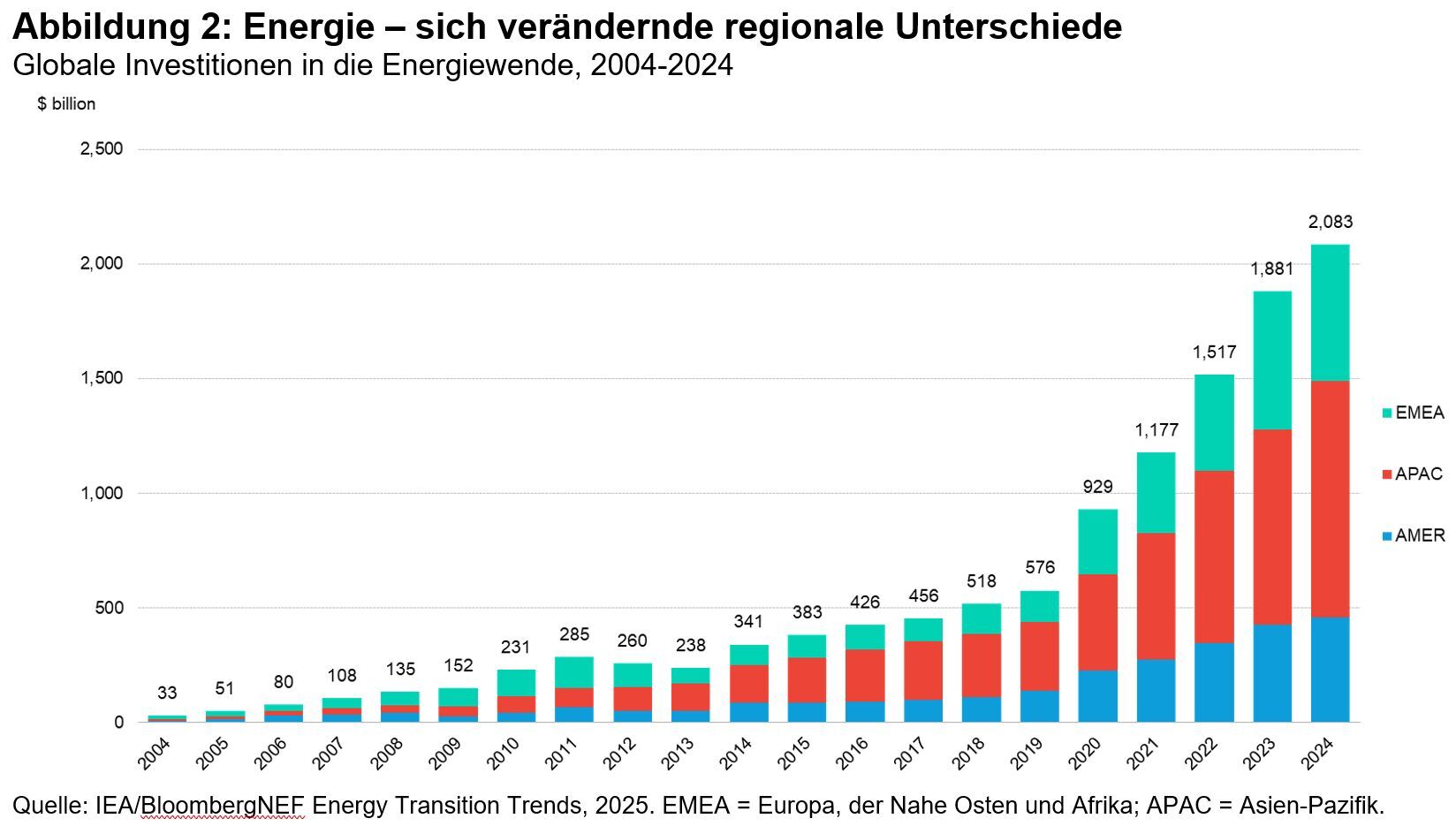 Ein weiteres Thema, das auch in Zukunft relevant bleibt, ist die Energiewende. Das Aus für den US-amerikanischen Inflation Reduction Act hat die Dynamik in den USA definitiv gebremst, doch global werden die weltweiten Investitionen in erneuerbare Energien, Elektrifizierung und Netzinfrastruktur anhalten. 2025 wurden bisher 2,2 Billionen US-Dollar in erneuerbare Energien, Kernenergie, Netze, Speicher, emissionsarme Brennstoffe, Effizienz und Elektrifizierung investiert. Das ist doppelt so viel wie die 1,1 Billionen US-Dollar, die in Öl, Erdgas und Kohle geflossen sind1. In Europa und Teilen Asiens sind die politische Unterstützung und das Engagement der Unternehmen nach wie vor stark (Abbildung 2). Die Energiewende wird also auch weiterhin Kapitalmarktchancen bieten, auch wenn die Fortschritte wahrscheinlich uneinheitlich ausfallen werden.