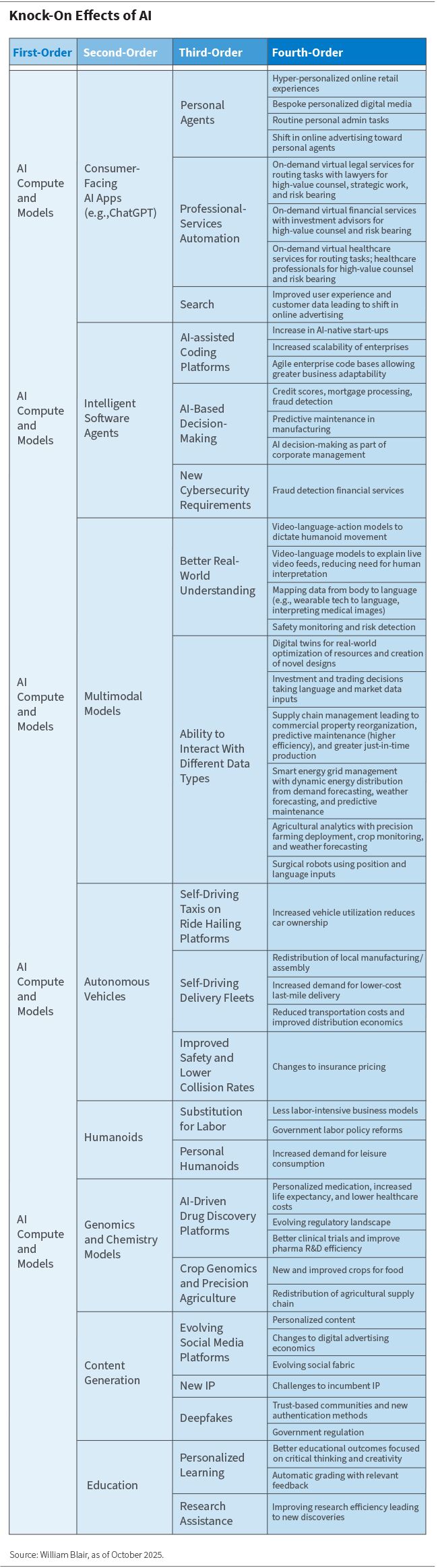 Oft sind es die Ergänzungen zweiter Ordnung, wie autonome Fahrzeuge und humanoide Roboter, die dem Code ein physisches Gesicht geben und so schließlich die Zweifler überzeugen, auch wenn die technischen Argumente für die Einführung robust sind, wie wir hier erläutert haben. Bis dahin können sich die Preise jedoch bereits verändert haben. Ich halte es für besser, mit den Grundlagen der Technologie zu beginnen und nach vorne zu schauen: Stellen Sie sich diese KI-Anwendungen und Maschinen jetzt vor und skizzieren Sie die Schocks mehrerer Ordnung, die diese Erfindungen auslösen werden. Meiner Meinung nach liegt der Alpha-Faktor darin, diese Auswirkungen zu antizipieren.