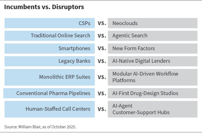 Da KI die Wettbewerbsgrenzen verschiebt, stehen Investoren vor der immer wiederkehrenden Entscheidung: Sollten sie auf die etablierten Unternehmen setzen oder sich auf die Seite der Aufsteiger schlagen? Clay Christensens „The Innovator’s Dilemma“ befasst sich mit dieser Entscheidung.5