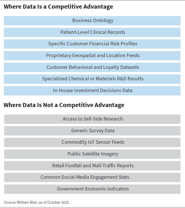 Daten sind nur dann von größter Bedeutung, wenn sie sowohl proprietär als auch hochspezifisch/nicht fungibel sind – beispielsweise Patientenakten im Gesundheitswesen oder maßgeschneiderte Risikoprofile im Finanzwesen – oder wenn sie in differenzierte Modelle einfließen, die eng mit den Frontline-Operationen verzahnt sind. In beiden Fällen führen Exklusivität und Nähe zum Endnutzer zu hohen Wechselkosten für den Kunden oder zu differenzierten Modellen, die von Wettbewerbern nicht ohne Weiteres kopiert werden können.
