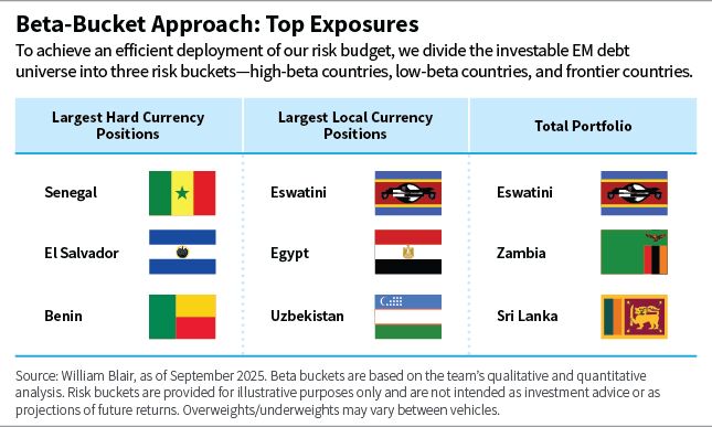 In diesem Umfeld konzentrieren wir uns auf Frontier-Märkte, die glaubwürdige politische Rahmenbedingungen, eine unterstützende Reformdynamik und attraktive Renditen bieten. Unsere Positionierung spiegelt diese Überzeugung sowohl bei Hartwährungs- als auch bei Lokalwährungsanleihen wider, wobei sich das Engagement auf Volkswirtschaften konzentriert, deren Fundamentaldaten sich eindeutig in die richtige Richtung entwickeln.