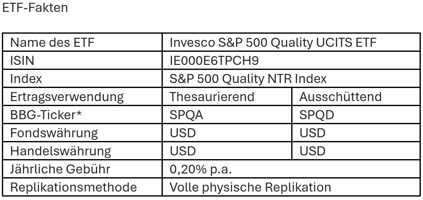 Der neueste ETF von Invesco bietet europäischen Investoren einzigartigen Zugang zum S&P 500 Quality Index und damit zu einer nach dem Qualitätsfaktor optimierten Auswahl an Unternehmen. Mit seinen defensiven Eigenschaften hat der Qualitätsfaktor seine Fähigkeit unter Beweis gestellt, langfristig bessere Ergebnisse zu erzielen als der breite Aktienmarkt. In der Vergangenheit haben Qualitätsaktien auch in konjunkturellen Abschwüngen und Phasen einer erhöhten Inflation zumeist relativ gut abgeschnitten. Der Invesco S&P 500 Quality UCITS ETF ist der einzige Fonds in Europa, der die Wertentwicklung des S&P 500 Quality Index nachbildet. Der Index enthält die 100 Unternehmen mit den höchsten Qualitätsnoten aus dem übergreifenden S&P 500 Index, die anhand von drei fundamentalen Kennzahlen errechnet werden: der Eigenkapitalrendite, der Rückstellungsquote und dem Verschuldungsgrad.