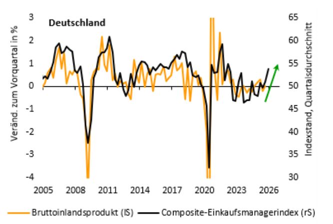 Die verbesserten wirtschaftlichen Rahmenbedingungen (Erhöhung der Infrastrukturausgaben, Senkung der Energiekosten, Bürokratieabbau etc.) werden mithin nicht zuletzt der Binnennachfrage und somit den Dienstleistungen zugutekommen. Der durch den Service-EMI initiierte deutliche Anstieg im Composite-EMI deutet jedenfalls auf eine namhafte Beschleunigung des Wachstums im 4. Quartal hin (vgl. nachfolgende Abbildung). Unsere Prognose steht im Einklang mit dieser Einschätzung. Wir erwarten im Schlussquartal einen BIP-Anstieg von rund 0,4% (im Vergleich zum Vorquartal). Es wäre das deutlichste Plus seit über drei Jahren und dürfte nur den Auftakt für eine Serie von namhaften Zuwächsen darstellen. Den permanenten Abgesang auf die deutsche Wirtschaft teilen wir daher nicht. 2026 dürfte es zumindest zu einem Zwischenhoch kommen, der das BIP-Wachstum auf über 1,5% hievt.