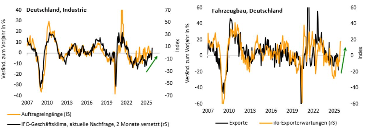 Am meisten Zuversicht geben jedoch die jüngsten Ergebnisse der Frühindikatoren, die im Oktober allesamt einen Sprung nach oben gemacht haben. So hat etwa laut ifo-Umfrage die Nachfrage nach deutschen Industriegütern spürbar angezogen, was sich zeitverzögert auch in der Auftragsstatistik widerspiegeln sollte (vgl. nachfolgende linke Abbildung). Darüber hinaus gibt es im stark gebeutelten deutschen Fahrzeugbau mehrere Lichtblicke (vgl. nachfolgende Abbildung rechts). Unter anderem hat sich der Exportausblick erkennbar aufgehellt – trotz der US-Zölle und dem aktuell diskutierten Chip-Mangel. Offensichtlich zieht – nach einer längeren Durststrecke – jetzt auch wieder die europäische Autonachfrage an.