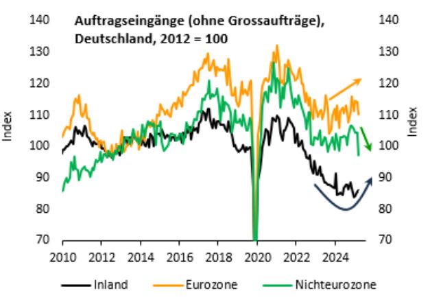 Wir gehen jedoch davon aus, dass sich dies in den nächsten Monaten ändert und die positiven Effekte aus der expansiven deutschen Fiskalpolitik eindeutig die Oberhand gewinnen. Erste Indizien dafür liefert bereits die Auftragsstatistik. So verzeichnete der »Sonstige Fahrzeugbau« im September einen Orderschub von 7,5% (im Vergleich zum Vormonat). In diesem Sektor werden auch Bestellungen von Militärfahrzeugen verbucht, der genaue Wert wird aber – anders als bei Flugzeugen, Schiffen und Zügen – geheim gehalten. Bei Letzteren haben deutliche Minuszeichen im September dominiert (z.B. Luftfahrt: -5,3% und Schienenfahrzeuge: -55,3%). Das Plus kann daher nur von den Militärfahrzeugen stammen. Dies dürfte indes erst der Anfang gewesen sein. Den eigentlichen Beginn der Auftragsflut erwartet die Rüstungsindustrie im laufenden Quartal. Positiv zu werten ist darüber hinaus die Stabilisierung bei der Inlandsnachfrage, worin sich ebenfalls erste Effekte des Fiskalpakets widerspiegeln sollten (vgl. vorangehende Abbildung).