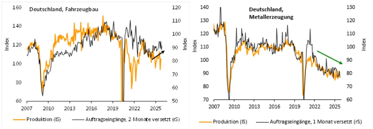 Im August war der Fahrzeugbau der Übeltäter für den Produktionseinbruch. Auch wegen der ungünstigen Lage der Betriebsferien sackte der Output um 16,7% ab. Nun folgte mit +12,3% die Gegenbewegung. Damit liegt die Autoproduktion aber immer noch gut 5% unter den Niveaus vom Frühsommer (vgl. nachfolgende linke Abbildung). Darüber hinaus befinden sich nach wie vor die Aktivität des Maschinenbaus und der Metallerzeugung (unter anderem: Stahl) im übergeordneten Abwärtstrend. Die Produktion gab hier im September um 1,1% bzw. 3,8% nach. Die jüngsten Auftragseingänge dieser beiden Sektoren geben auch noch keine Hoffnung, dass sich daran schnell etwas ändert (vgl. nachfolgende rechte Abbildung).
