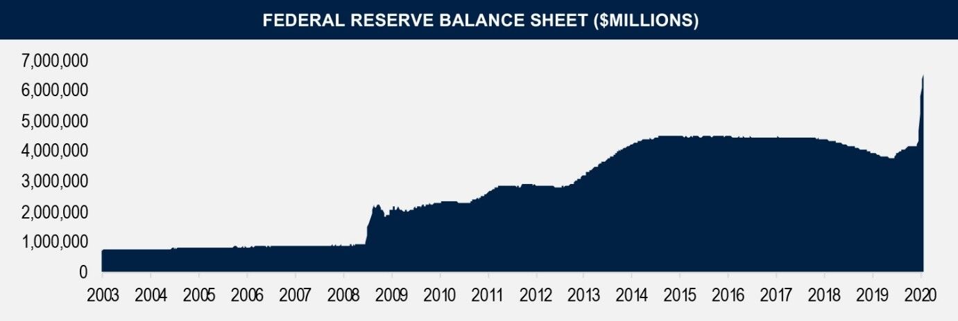Durch dieses rasche Handeln haben sie das Vertrauen der Marktteilnehmer in das generelle Funktionieren der Finanzmärkte und deren Glauben daran gestärkt, dass Nachfragelücken, die durch die Stilllegung großer Teile der US-Wirtschaft entstanden sind, gefüllt werden. Die USA sind nicht das einzige Land, das geld- und fiskalpolitische Impulse beschloss, um die Märkte zu stabilisieren und die Wirtschaftstätigkeit potenziell rasch wieder hochzufahren, wenn die eine oder andere Region des Landes die Beschränkungen für die Wirtschaft nach und nach aufhebt. Die nachstehende Grafik zeigt die Höhe der Fed-Bilanz seit 2003 und bietet darüber hinaus einen Überblick über die zehn größten Volkswirtschaften weltweit und die von ihnen im Jahr 2020 bisher angekündigten Konjunkturpakete.