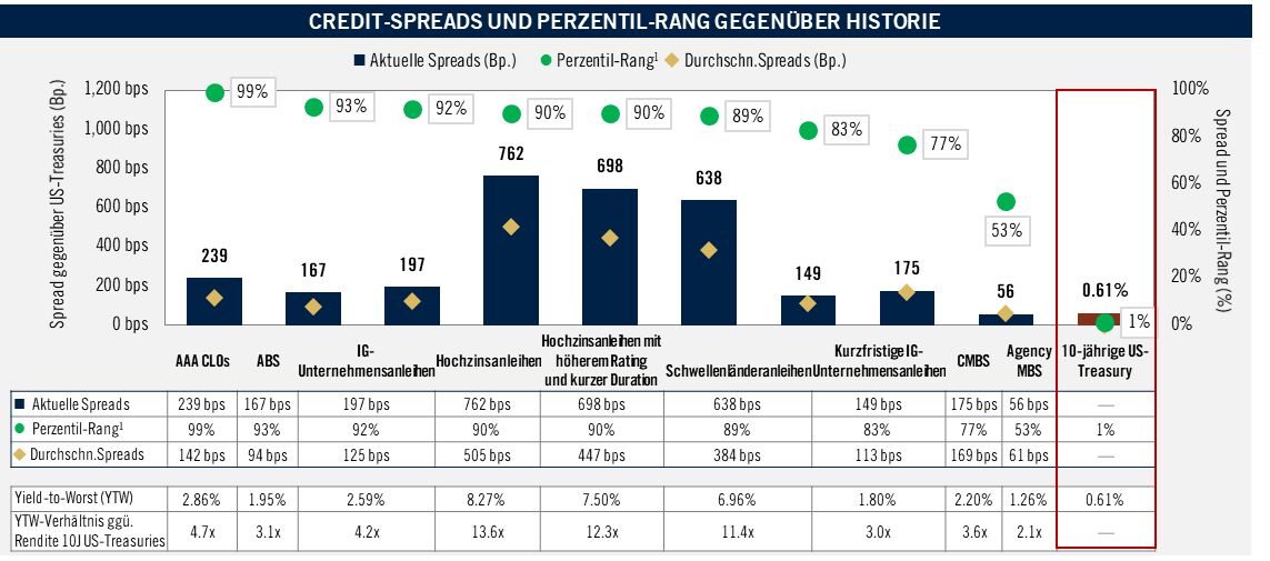In der nachstehenden Grafik geben die grünen Punkte wieder, in welchem Perzentil die Credit-Spreads jeder genannten Anlageklasse in der Vergangenheit rangierten. Je höher die Zahl, umso günstiger ist der Sektor im Vergleich zu den historischen Niveaus bewertet. Beispielsweise notieren die Spreads von Collateralized Loan Obligation (CLO) mit einem Rating von AAA derzeit im 99. Perzentil. Das bedeutet, dass der Sektor im Laufe seiner Historie in 99% der Zeit geringere Spreads aufwies – oder teurer war – als jetzt. Das heißt, der Sektor notiert gegenwärtig unweit seiner aus historischer Sicht stärksten Unterbewertung. Alle Spread-Sektoren in der Grafik bewegen sich aktuell auf historisch sehr günstigen Niveaus: