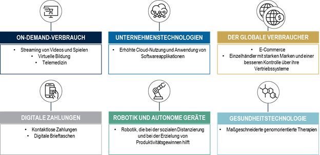 Mark Baribeau: Durch die aktuelle Marktstörung bringen Anleger Unternehmen, die ihre Geschäftsprozesse laufend verbessern, eine höhere Wertschätzung entgegen. Aus unserer Sicht bieten viele der Unternehmen, die in den letzten Jahren zu den Gewinnern zählten, differenzierte und disruptive Geschäftsmodelle, die in dem aktuellen Umfeld noch attraktiver geworden sind. Diese Krise hat die Macht des mobilen Internets und seiner Omnipräsenz in unserem Leben verdeutlicht. In nur wenigen Monaten entwickelte sich Amazon zu einem „unverzichtbaren Geschäft“, Netflix diente als Mittel gegen die Langeweile der zwangsweisen Stubenhocker und Cloud-basierte Plattformen wurden in dem größten Homeoffice-Experiment der Welt für Unternehmen und Arbeitnehmer unentbehrlich. Für die Zeit nach der Krise rechnen wir mit einer Beschleunigung der Digitalisierung und einer deutlich höheren Akzeptanz von Technologien, die weiterhin für ein enormes Wachstum sorgen werden. Außerdem gehen wir davon aus, dass sich Bereiche wie E-Commerce, Streaming-Dienste für Videos und Spiele, digitaler Zahlungsverkehr und Cloud Computing immer stärker durchsetzen werden.